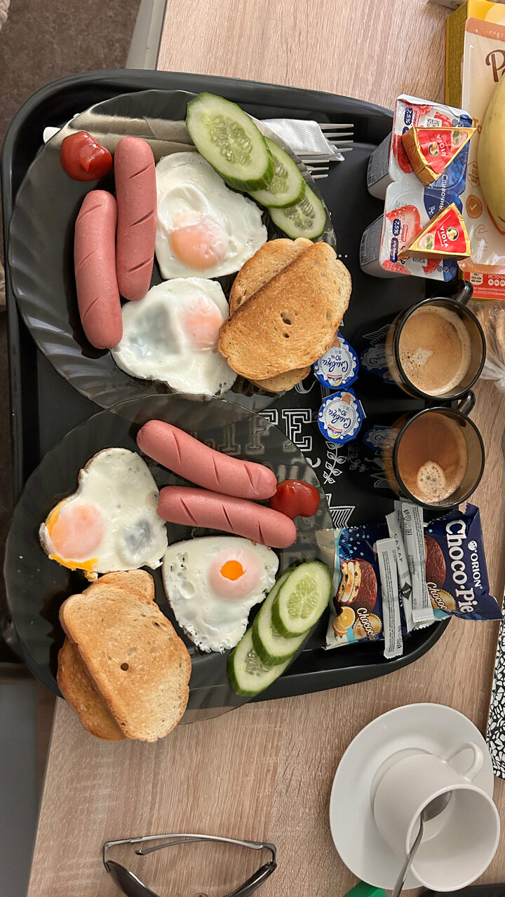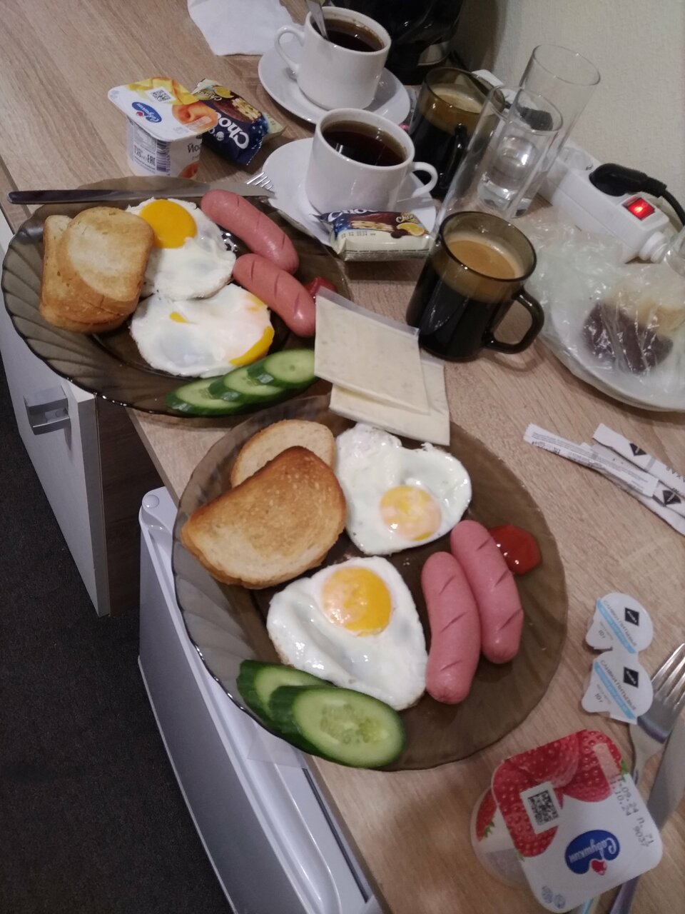 - Скудный "континентальный завтрак" (каша, блинчики из магазина, кофе из автомата).