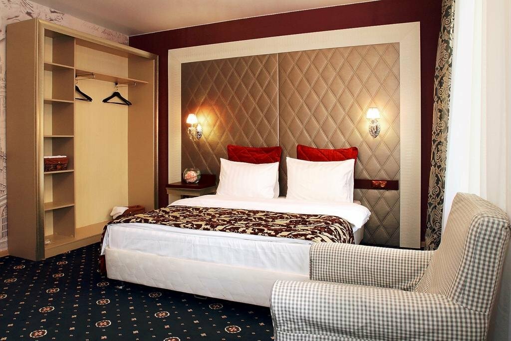 Просторный номер для тех, кто ценит удобство и комфорт. Современный дизайн, большая двуспальная кровать размера King size (180*200 см), ортопедический матрас и продуманное до мелочей оснащение номера послужат основой как для отдыха,так и для работы.