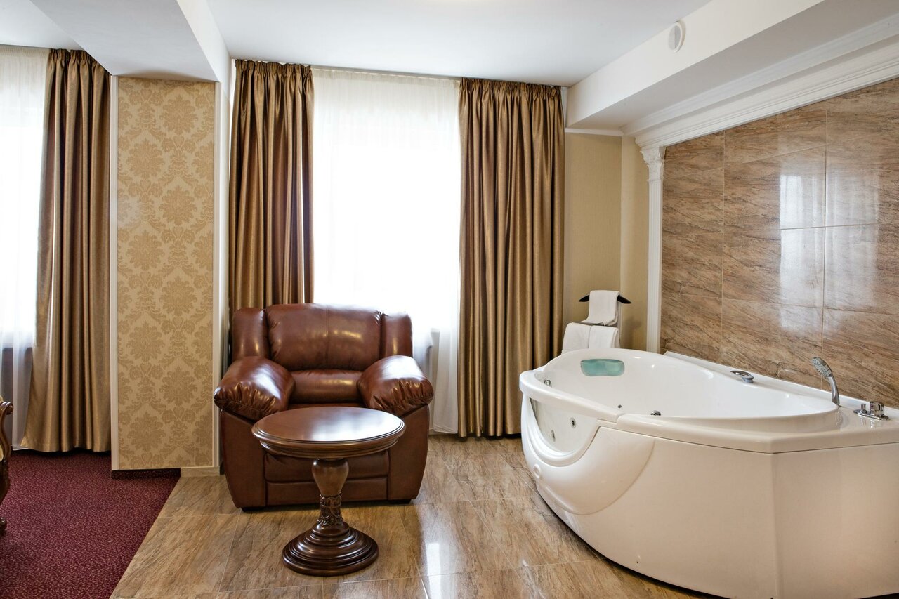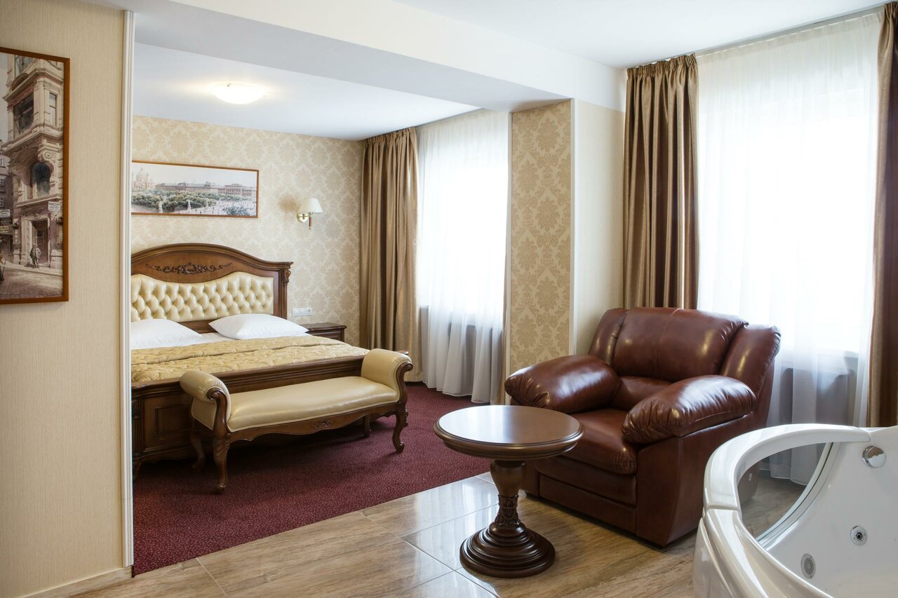 Роскошный двухкомнатный номер отеля Белладжио в Ростове-на-Дону, состоящий из гостиной, спальни и ванной комнаты с джакузи.