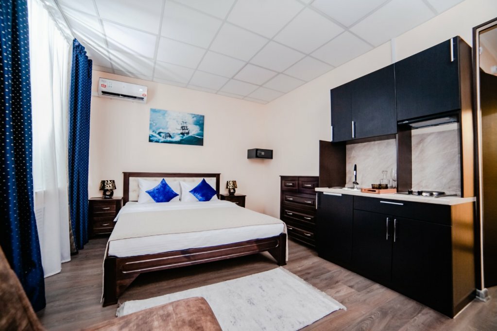 Услуги: — Цена за ночь: 4500–7000 ₽ — Круглосуточная стойка регистрации, камера хранения — Трансферы (платные): аэропорт, вокзалы, парки, торговые центры — Завтрак, чай/кофе в номерах, посуда, микроволновка — Удобства: фен, халат, тапочки, сейф, прачечная