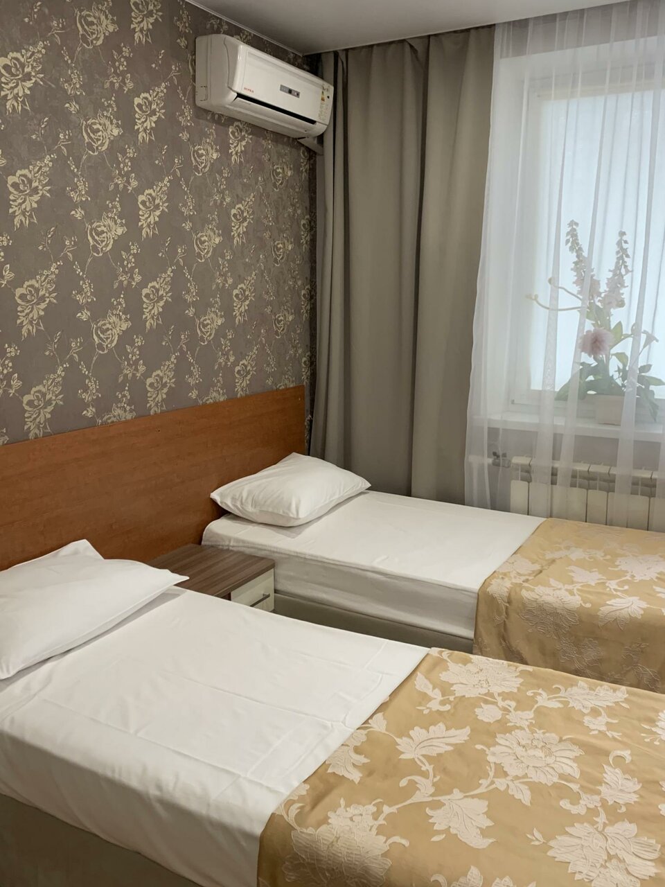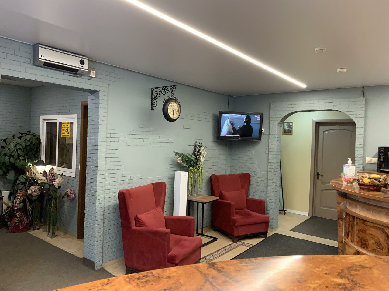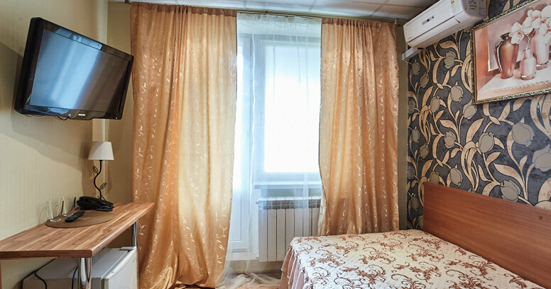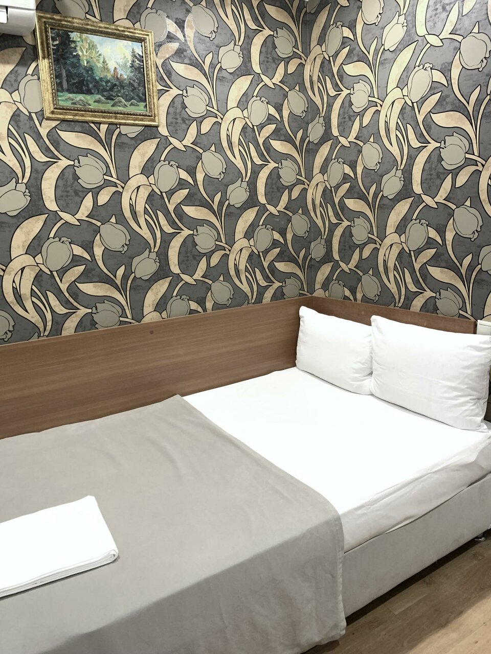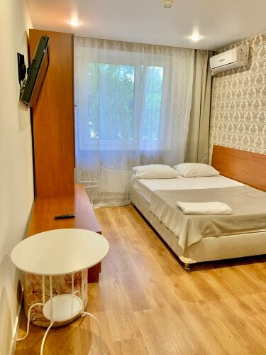 Не знаю с какого года эта гостиница, но явно требуется ремонт. И замена всего! Сначала шокировал запах еды, который мы не смогли проветрить даже в мороз. Одеяло одно тонкое, пришлось укрываться ещё халатами, при этом спали почти одетыми. Стол в пятна и царапинах. Телевизор переключали без пульта, как раньше, ‘самый мелкий побежал’. В душе стоит вода, нет полочек не в душе, не у раковины. Нет даже обычных крючков, чтобы повесить одежду. Вроде мелочи, но это создавало неудобства. В комнате из посуды два стакана. Дали чайник, но без чашек. Пили чай из стаканов. Можно ещё что то вспомнить, но не буду. Не советую. У нас не было выбора, почему то не было мест на наши даты подходящего по цене.