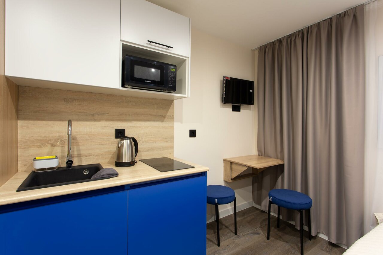 - Новая техника и мебель в номерах.; Наличие чайника, посуды, микроволновки и холодильника.; Приветливый и дружелюбный персонал.; Удобное расположение (рядом метро и достопримечательности).; Полное соответствие номеров фотографиям.