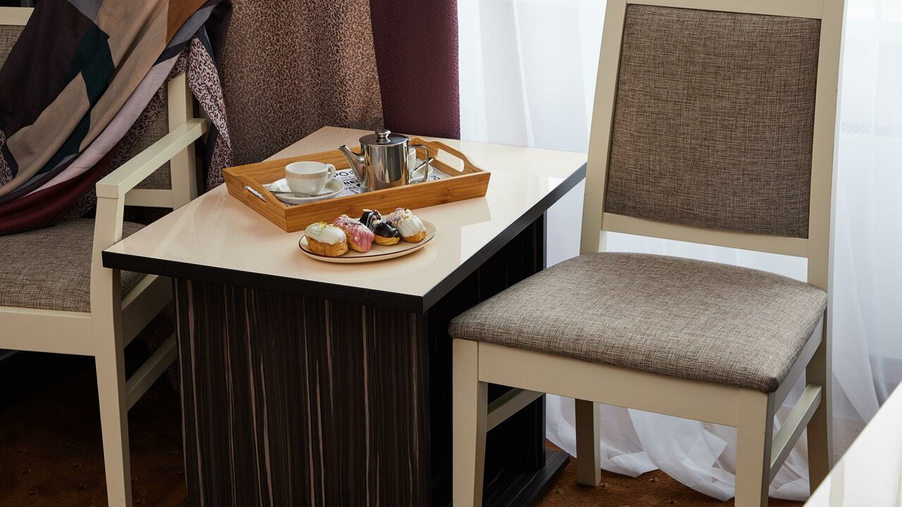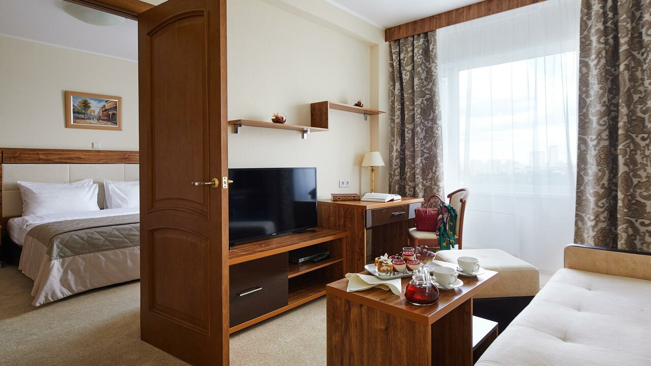 Улучшенный однокомнатный номер, небольшая прихожая, спальная комната двуспальная кровать 160×200, кондиционер, журнальный столик, кресло, стул, холодильник, телевизор и телефон. В номере ванная комната, фен, тапочки, комплект полотенец, косметич...