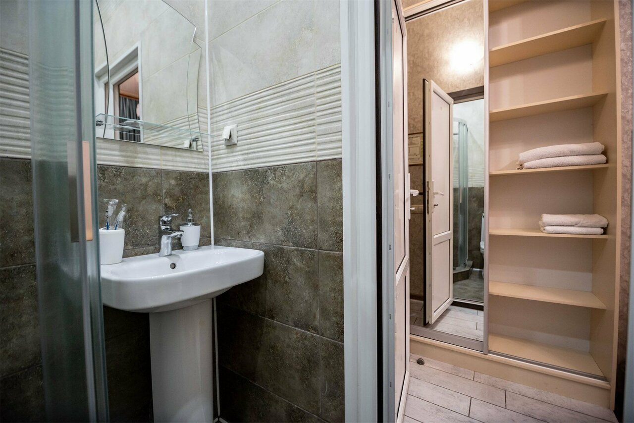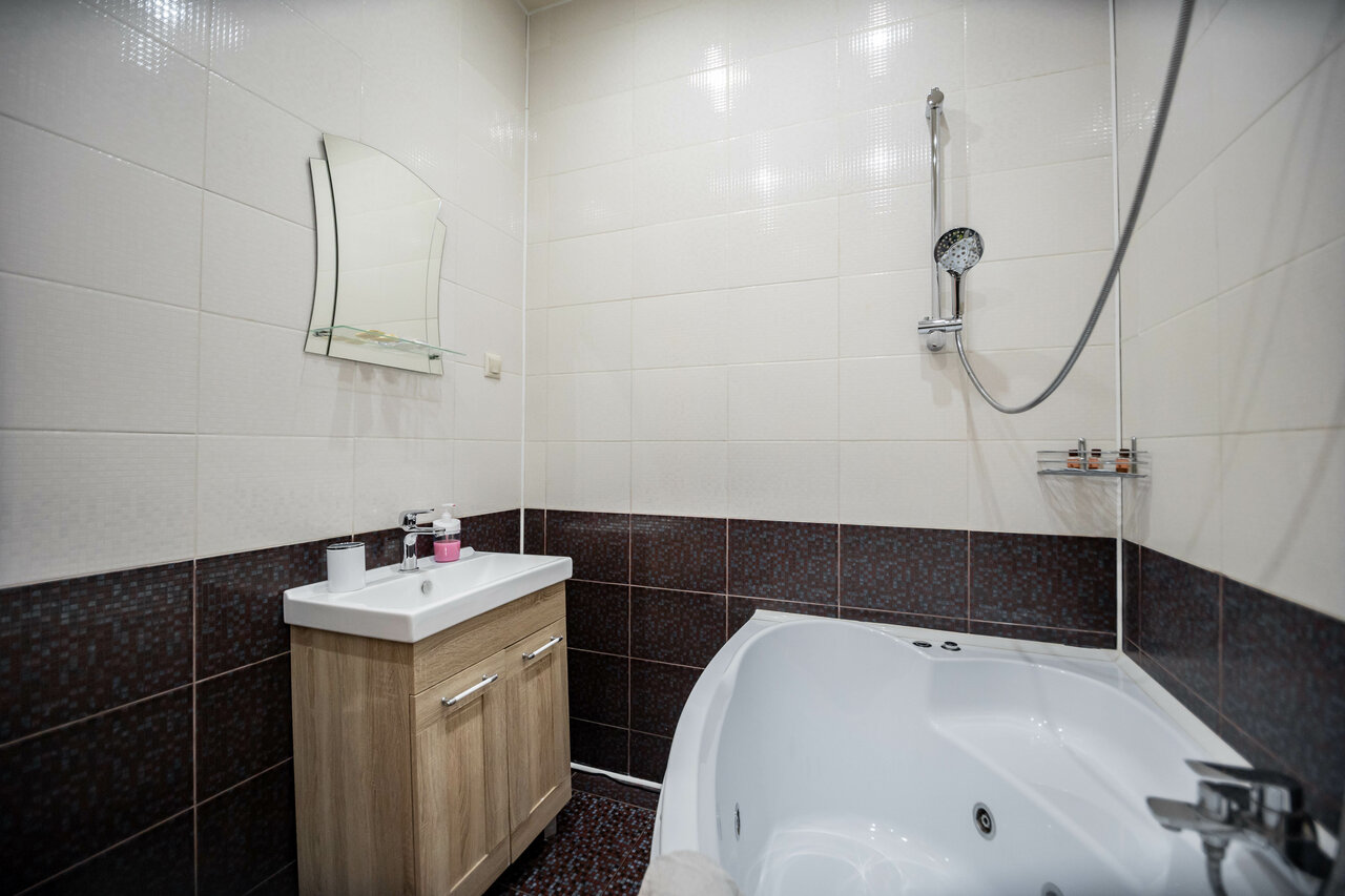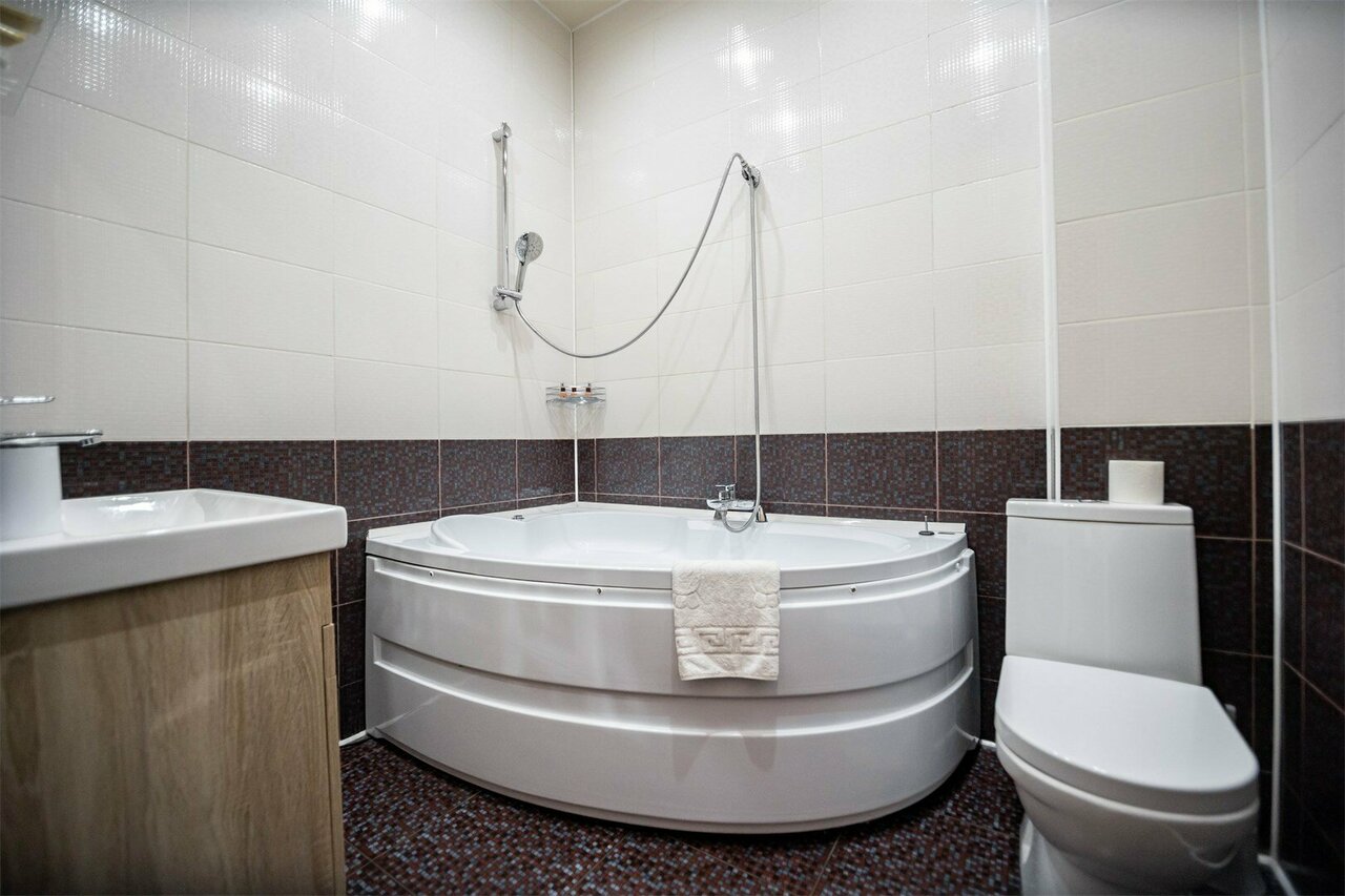Уютный увеличенный номер с двуспальной кроватью и односпальной кроватью, хорошие матрасы для комфортного сна. Сан узел с джакузи и гидромассажем.