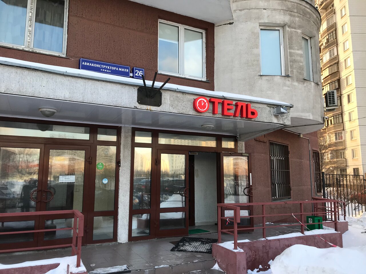 Расположена в Москве по адресу: ул. Авиаконструктора Миля, 26 (1 этаж). Мини-отель категории 3 звезды предлагает недорогие номера на час или более длительный срок. Гостиница работает круглосуточно, заезд — с 14:00, выезд — до 12:00.
