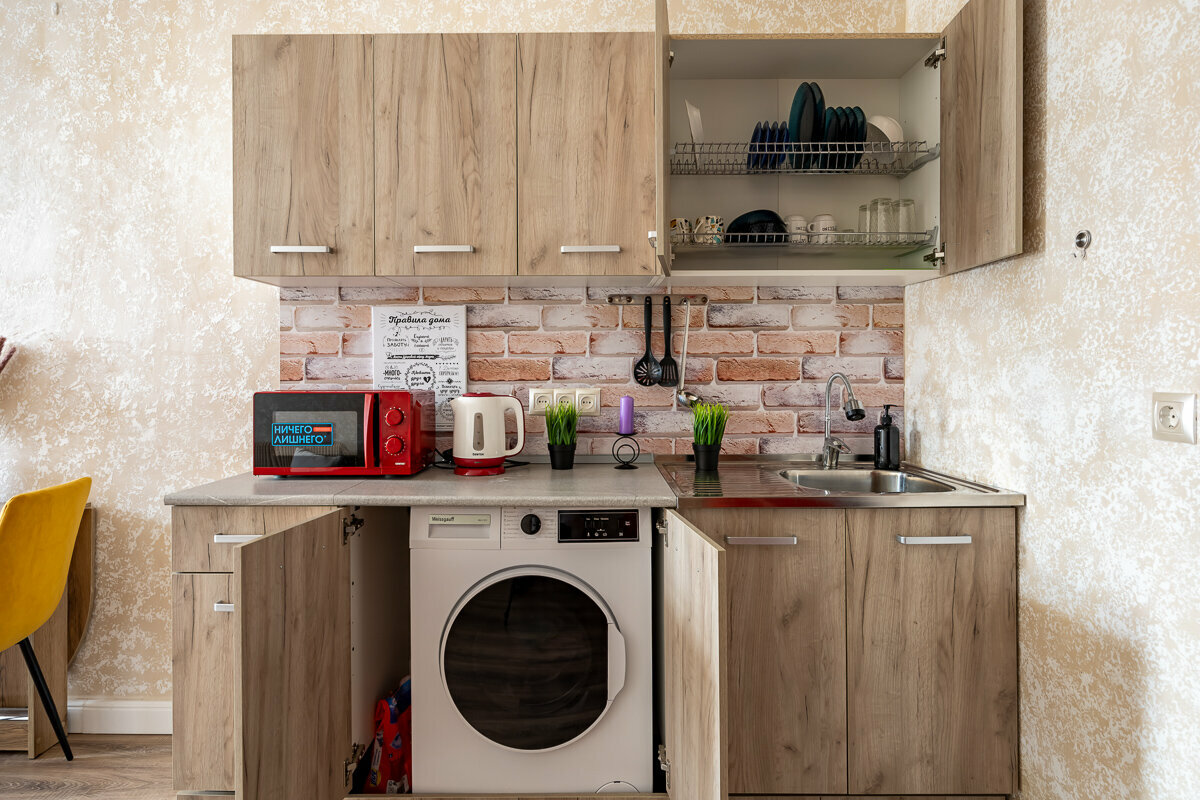 - Внимание к деталям (пледы, посуда, стиральная машина).