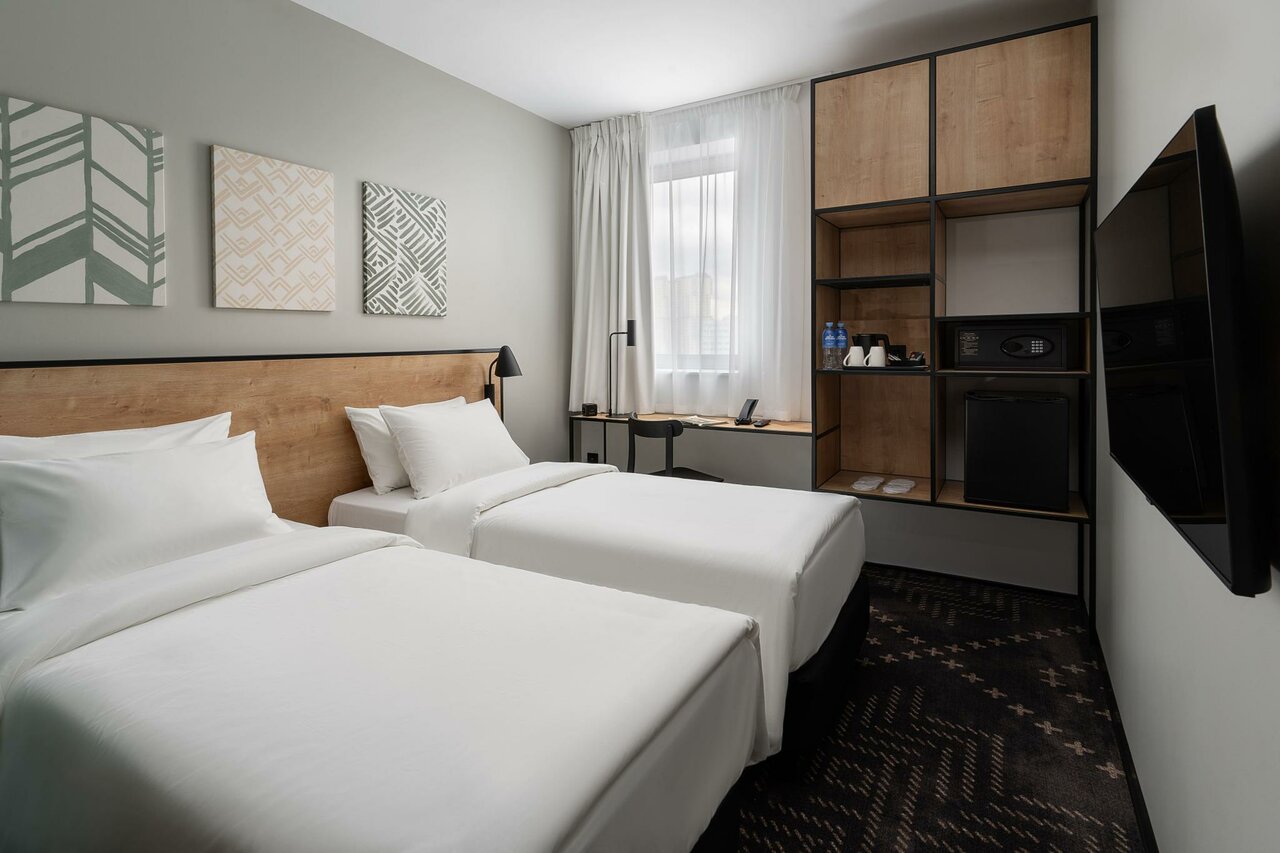 Новенький, функциональный отель. Пространства не много, но все продуманно. Удобная кровать, хорошая шумоизоляция в номерах.