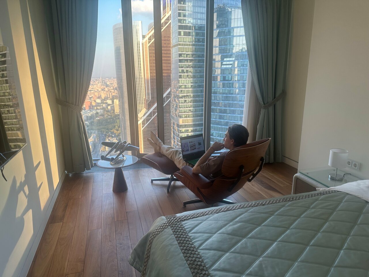 Снимали 2х-комнатную квартиру впятером, на 46-м этаже. Невероятный вид из окна — вся Москва перед тобой, напротив (к счастью) нет ни одной высотки Москва-Сити. Чисто, красивый и уютный дизайн. Добираться от метро также удобно. В номере было всё, что необходимо. Спасибо большое!