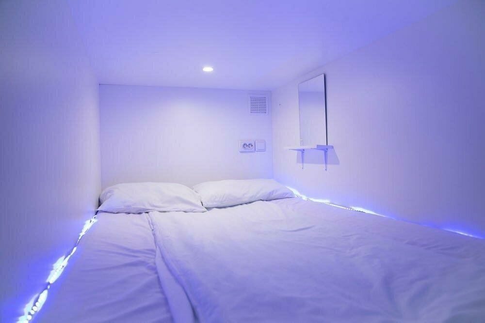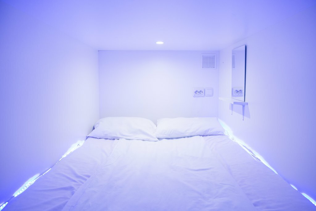 Спальная капсула увеличенного размера - освещение, полочка, розетки, зеркало, крючки для вещей- Постельное белье,полотенце,шампунь и гель для душа- Закрывающийся локер для ценных вещейИфраструктура отеля - wi-fi, кухня, лаундж, завтраки