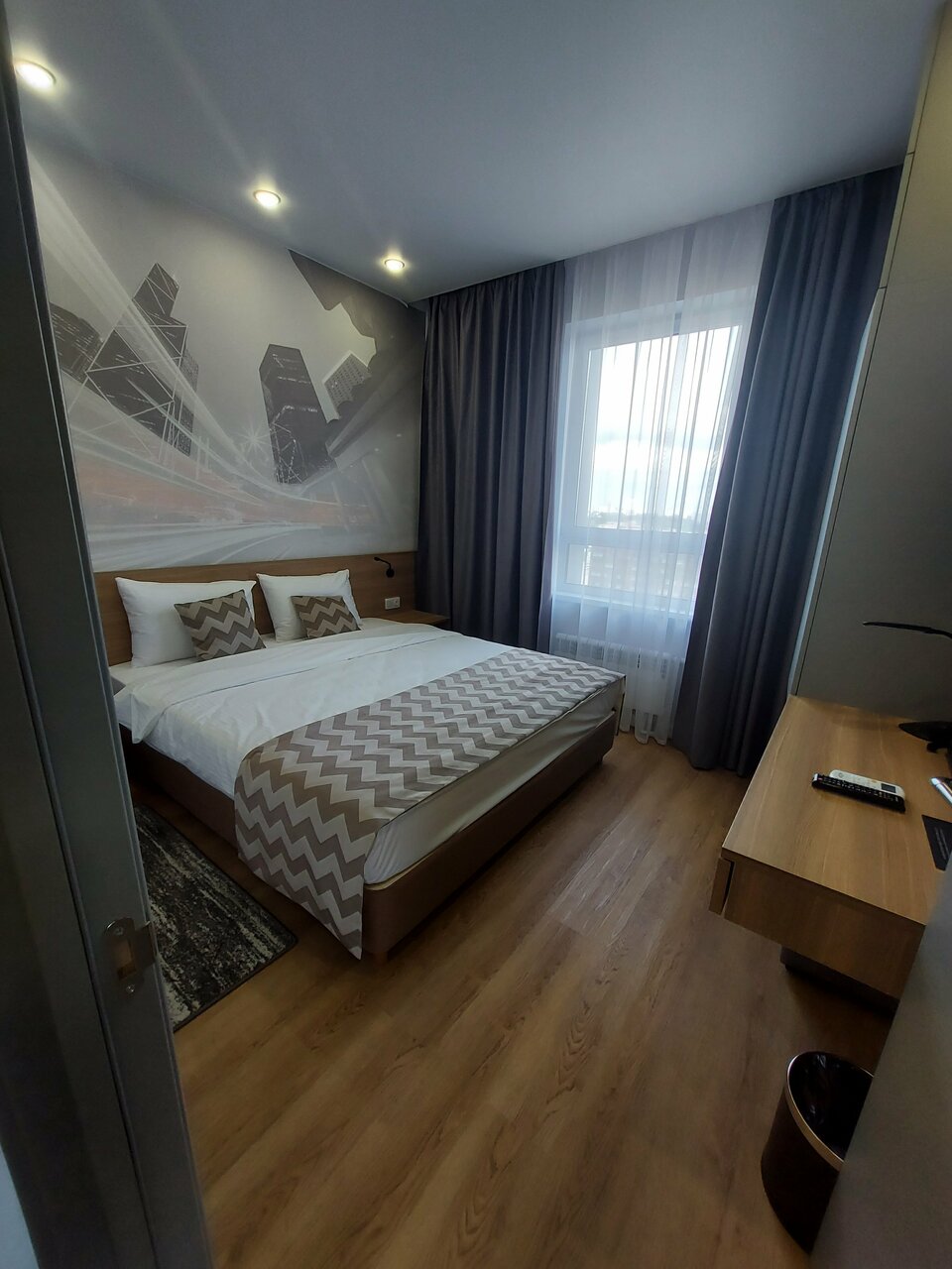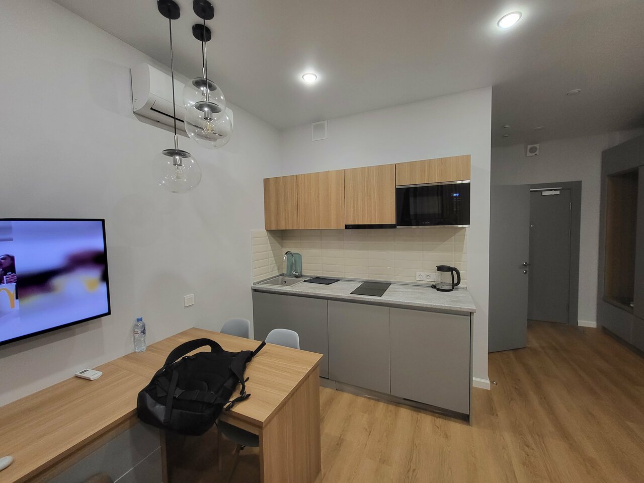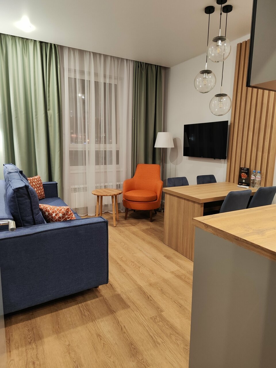 Из плюсов: расположение топ. Метро в шаговой доступности. Сотрудники на ресепшн вежливые. Минусы: сэкономили в отеле вообще на всем. Отель новый, а выглядит уже очень поюзанно. Нас сперва заселили в номер, где не работала душевая лейка, в туалете были следы использования предыдущих жильцов и полотенца были грязные (в целом уборка на 3+). Нам предложили другой номер и мы согласились переехать. В душевой кабине очень не хватало дверцы. Как бы аккуратно не купался, все брызжет на пол. Все в плесени от этого уже. Ещё какой-то гений додумался прикрутить декоративную люстру посредине между раковиной на кухне и обеденным столом. Я билась об неё головой минимум раза 3 в день. Хоть в номере и есть раковина, но не положили даже губку одну для мытья посуды и хоть маленькую бутылочку со средством для мытья посуды. Есть ПММ, но нет даже одной таблетки для мытья! Ну и зачем тогда она вообще нужна Чайник в накипи весь. Сама его как могла отчищала и промывала.