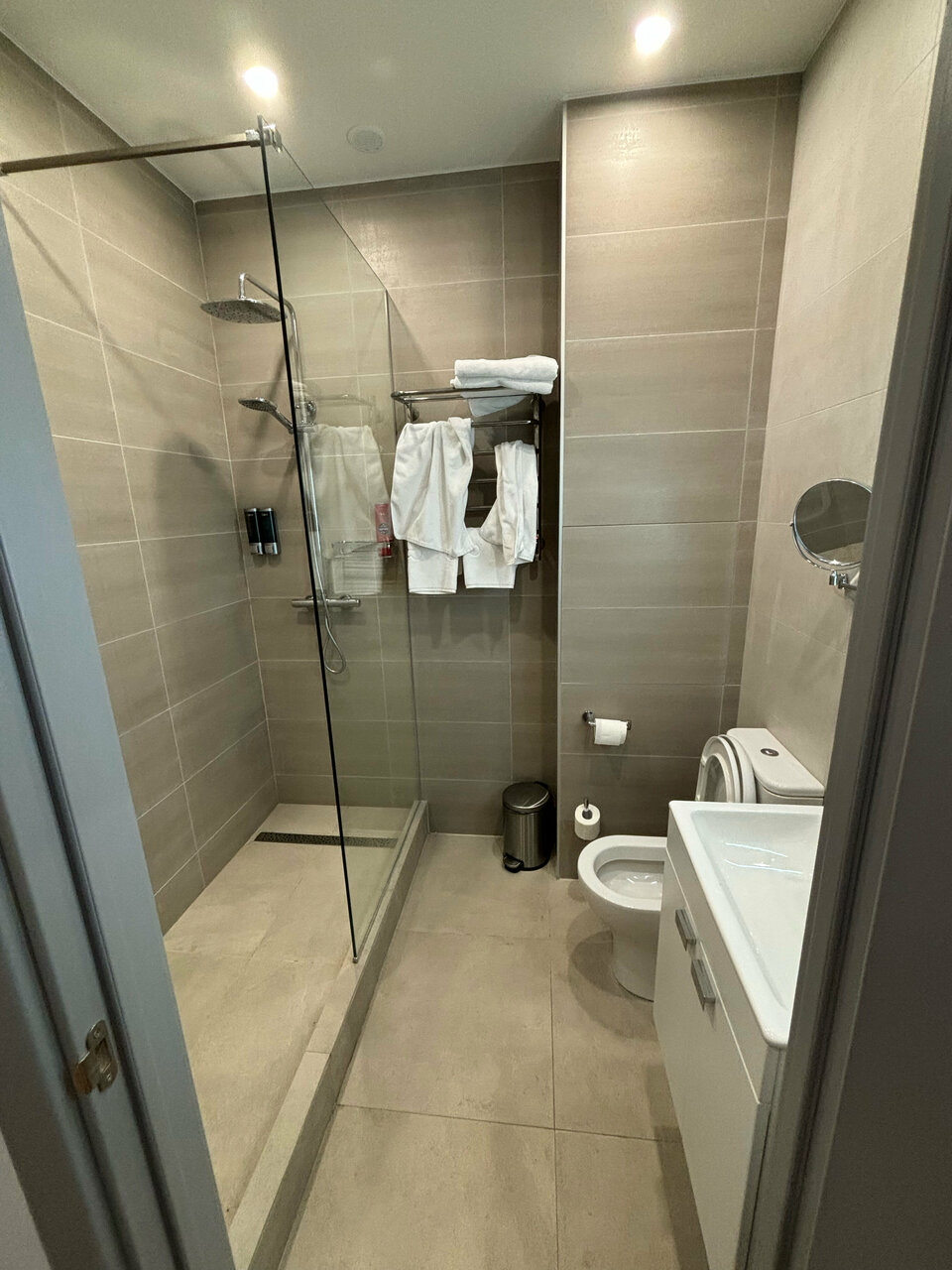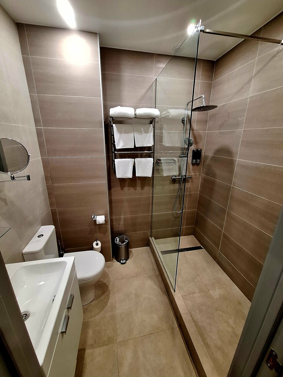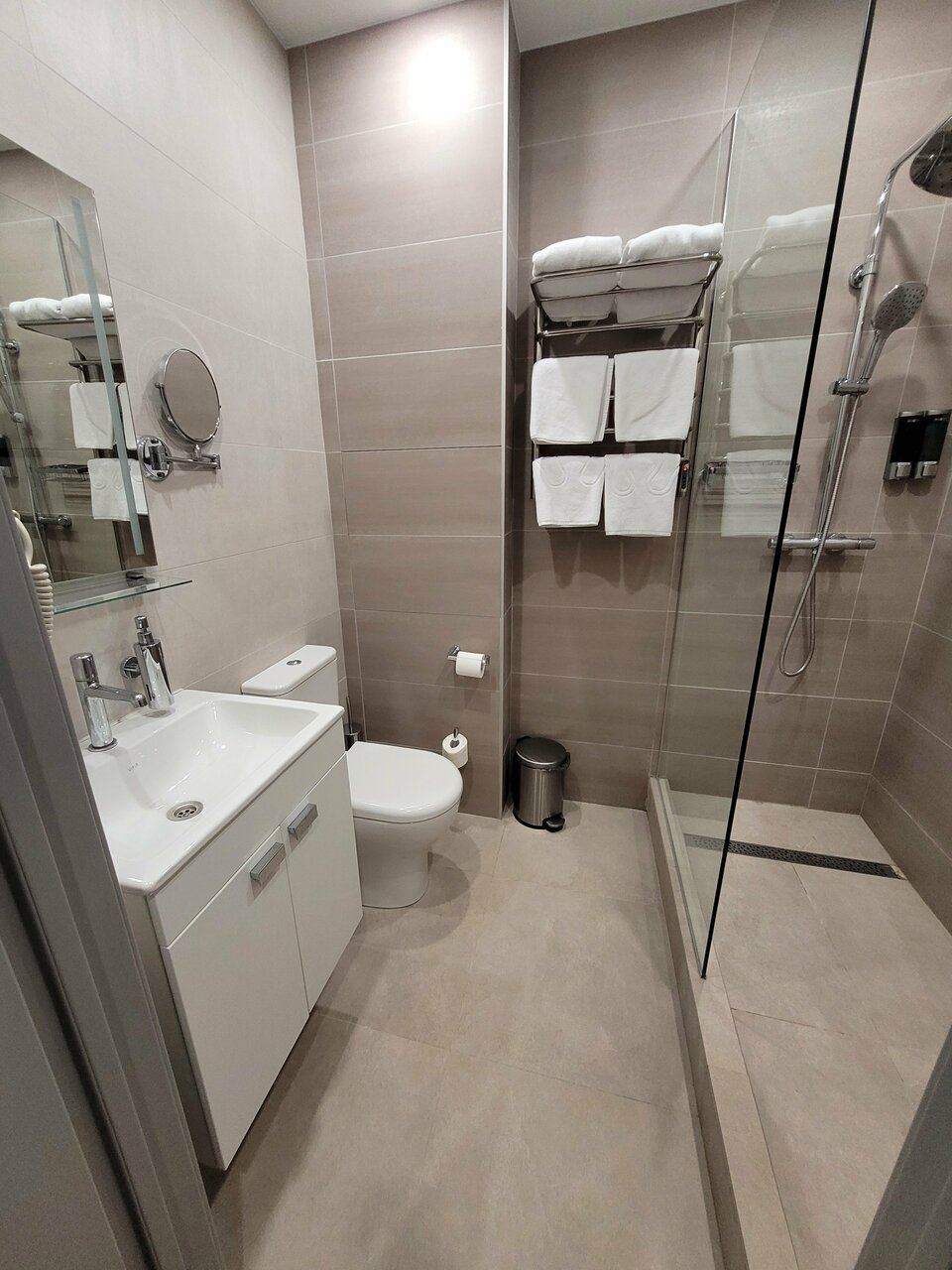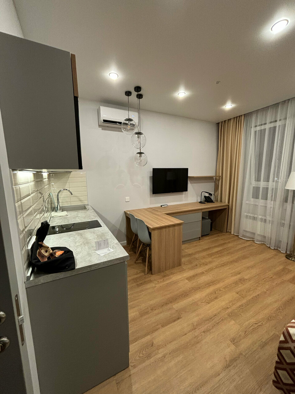 Из плюсов: расположение топ. Метро в шаговой доступности. Сотрудники на ресепшн вежливые. Минусы: сэкономили в отеле вообще на всем. Отель новый, а выглядит уже очень поюзанно. Нас сперва заселили в номер, где не работала душевая лейка, в туалете были следы использования предыдущих жильцов и полотенца были грязные (в целом уборка на 3+). Нам предложили другой номер и мы согласились переехать. В душевой кабине очень не хватало дверцы. Как бы аккуратно не купался, все брызжет на пол. Все в плесени от этого уже. Ещё какой-то гений додумался прикрутить декоративную люстру посредине между раковиной на кухне и обеденным столом. Я билась об неё головой минимум раза 3 в день. Хоть в номере и есть раковина, но не положили даже губку одну для мытья посуды и хоть маленькую бутылочку со средством для мытья посуды. Есть ПММ, но нет даже одной таблетки для мытья! Ну и зачем тогда она вообще нужна Чайник в накипи весь. Сама его как могла отчищала и промывала.