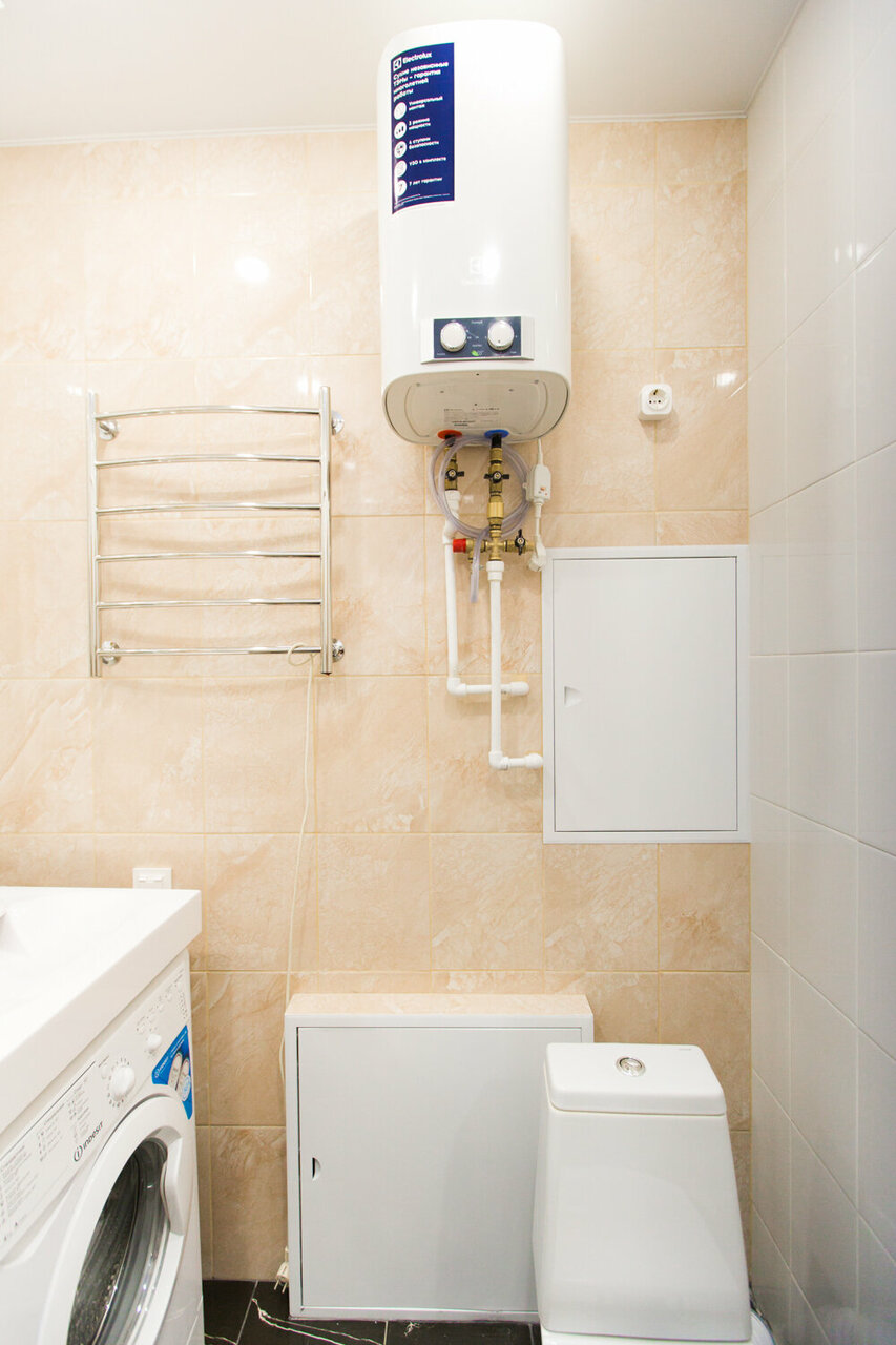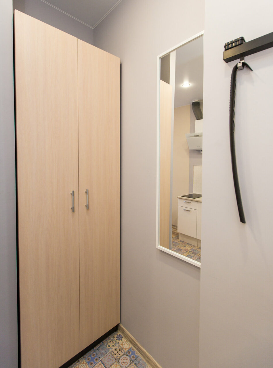 Очень мало места в душе — нормально помыться не получится. Отсутствуют вообще полки для размещения одежды, нет вешалок. Близко от метро, но кроме узенького тротуара нет никакой придомовой территории. В целом неудобно, не рекомендую