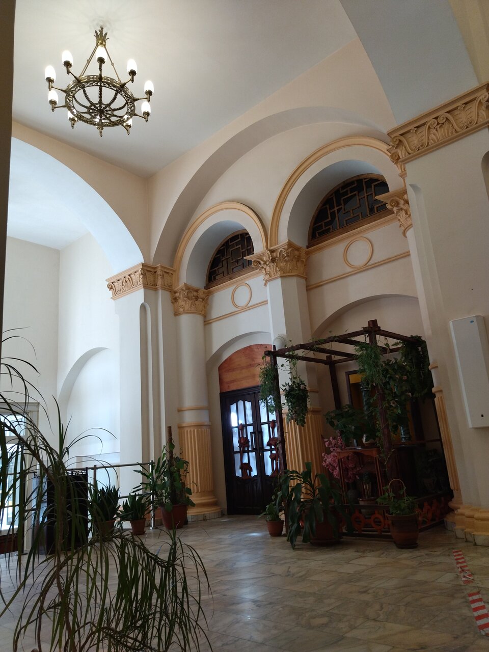 Потолки 3 метра, проводится качественный ремонт кухонь общего пользования на этаже. Персонал доброжелательный, в основном. Номера — блок на две комнаты (3+2 человека) + санузел совмещённый. Нет грузового лифта, есть маленький на 3х человек.