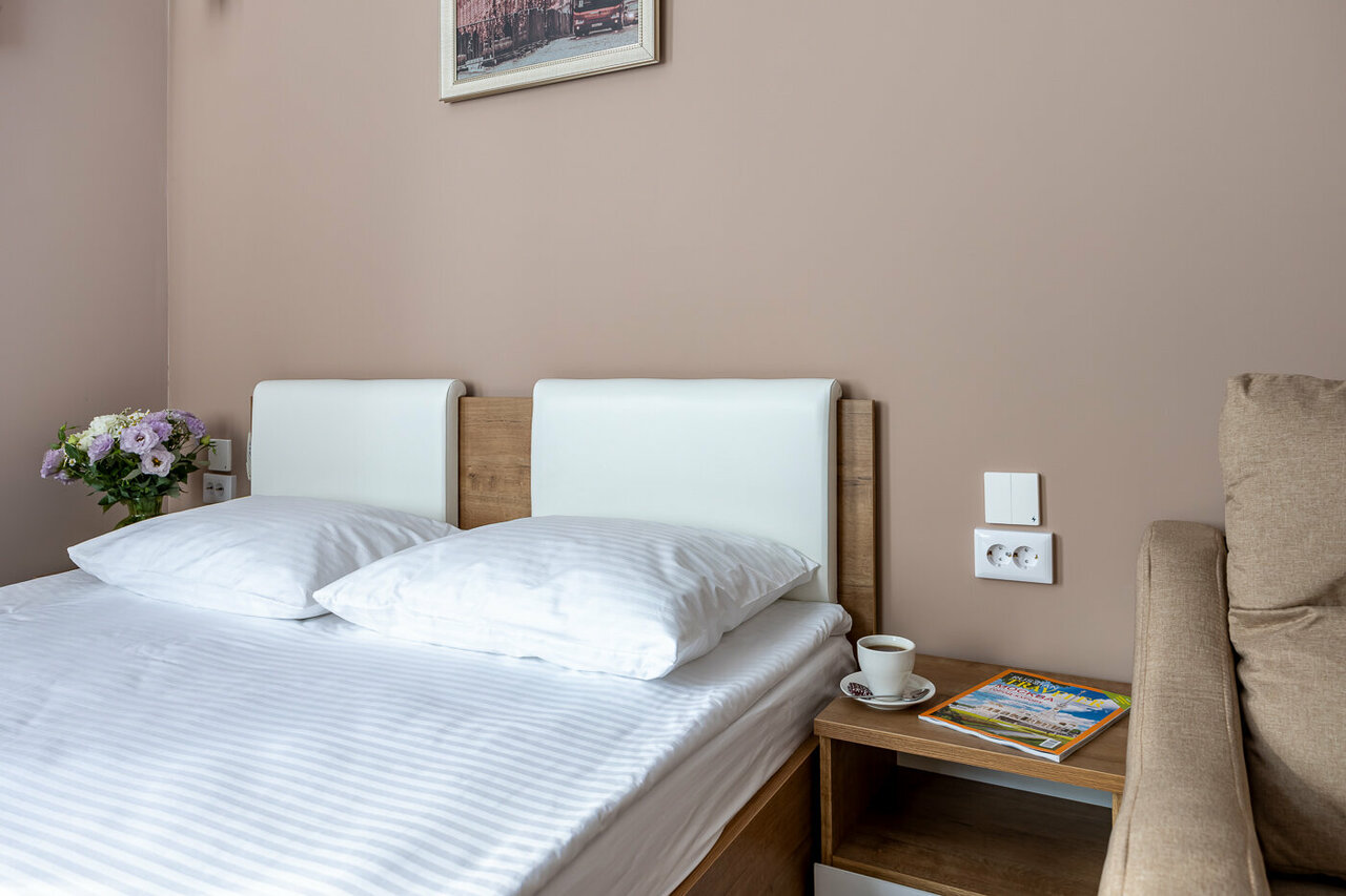 Заезд — с 14:00, выезд — до 12:00. Стоимость номера: от 4000 ₽ за ночь или час. Питание оплачивается отдельно, возможен завтрак по меню.