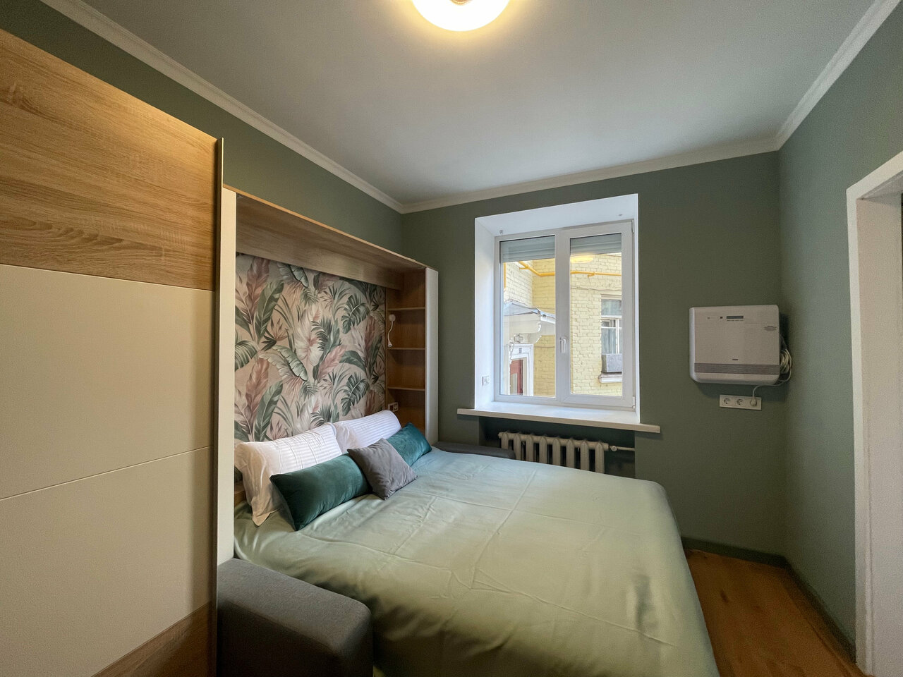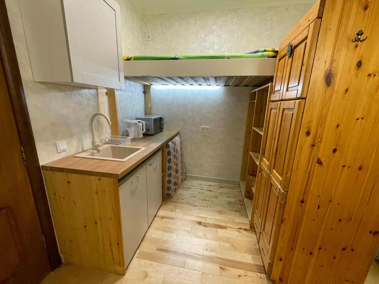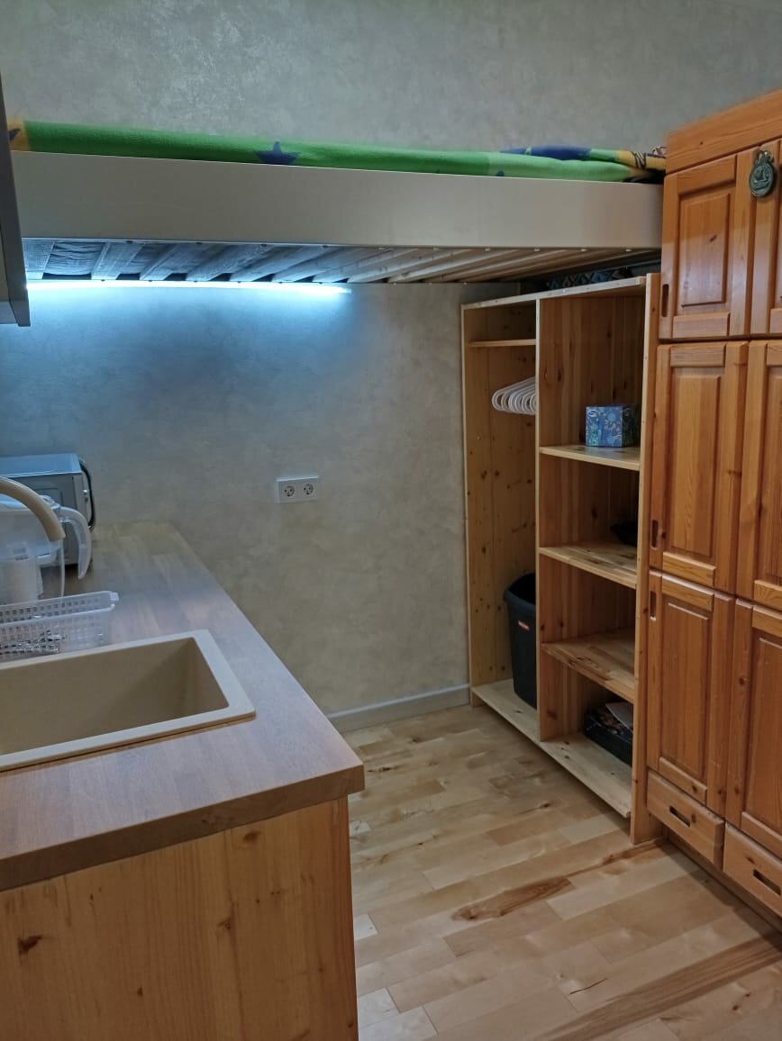 Студия с ванной и кондиционером площадью 21 кв м. Кровать двухместная 160х200 и кровать-чердак 90х200 разместят с удобством 2 отдельных человека или семью из 3 человек. Есть холодильник, СВЧ, чайник, индукционная плитка, кондиционер и бризер.