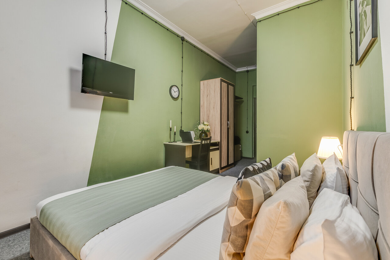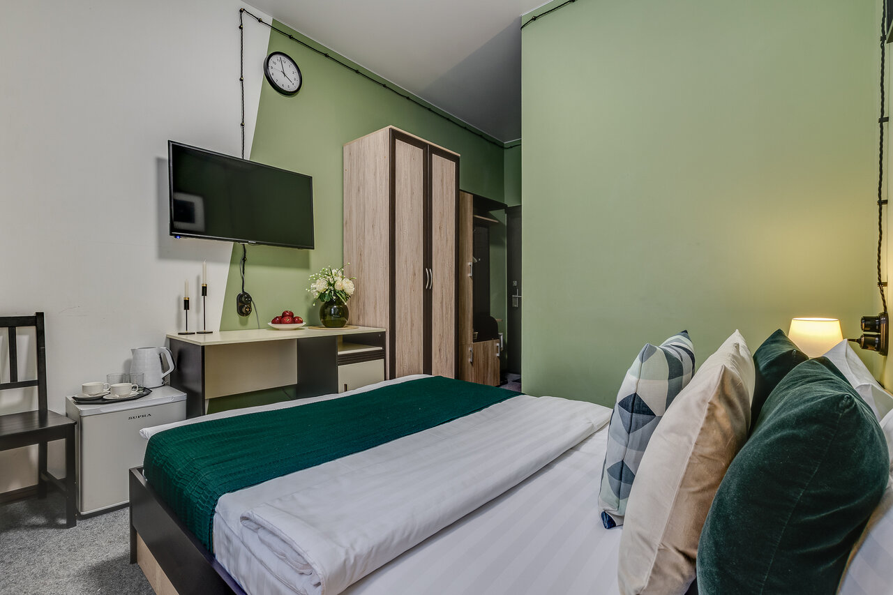 Площадь 17 м² Кровать Queen sizeШкафПисьменный столСтолПрихожаяТелевизорСейфХолодильникЧайникДушевая кабинаТуалетТуалетные принадлежностиПолотенцаПостельное бельеТапочки