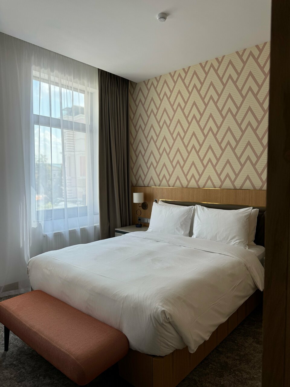 Новый отель в самом центре города. Открылся недавно, номера все с идеальным ремонтом. Очень вежливый и отзывчивый персонал на ресепшен. Особенно менеджер Ангелина. Все на высшем уровне, как и положено для этого бренда!