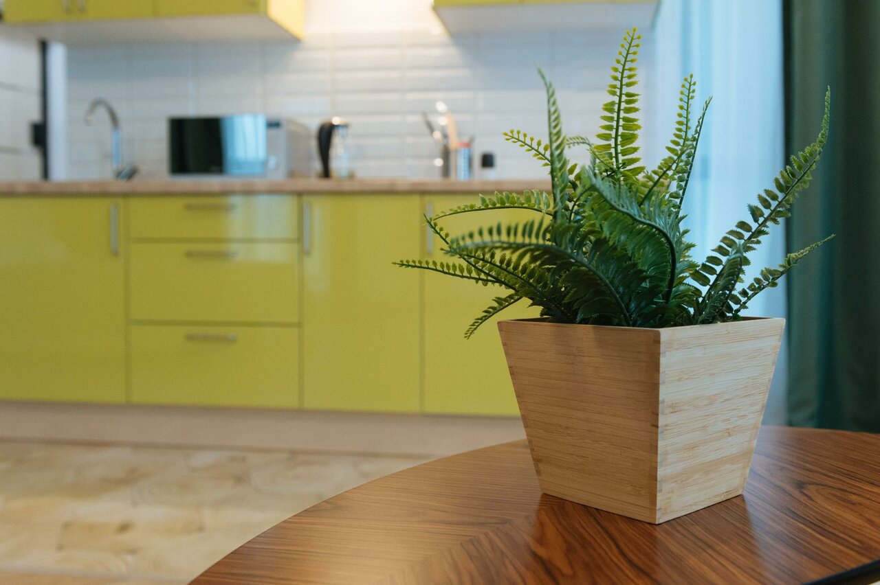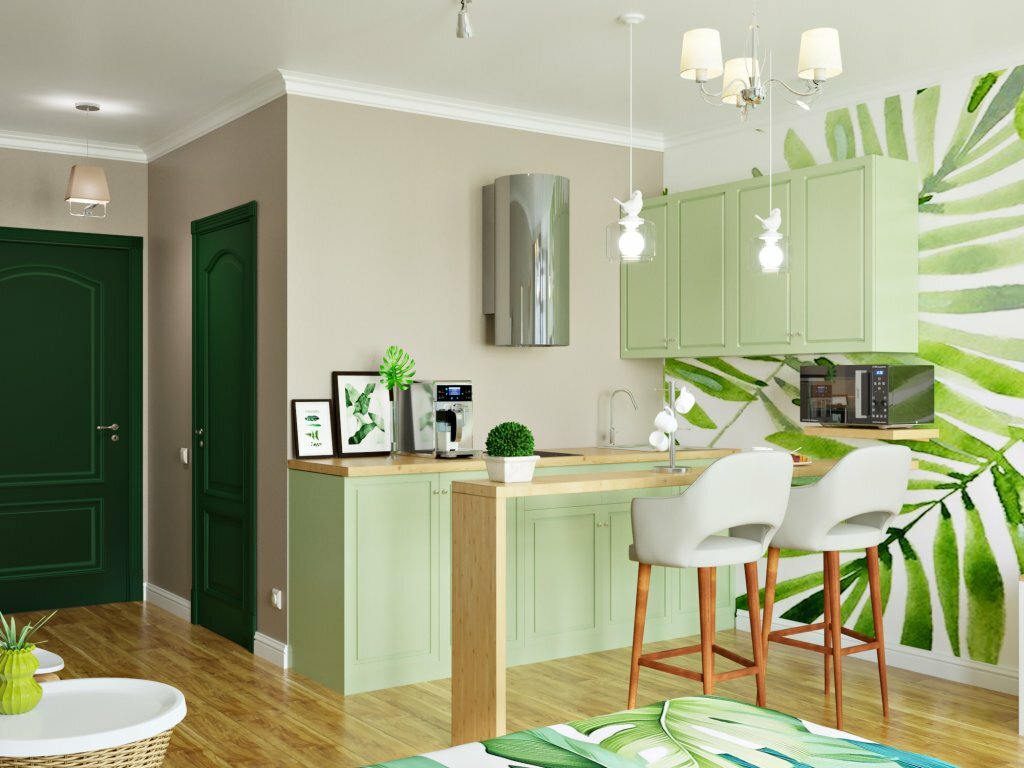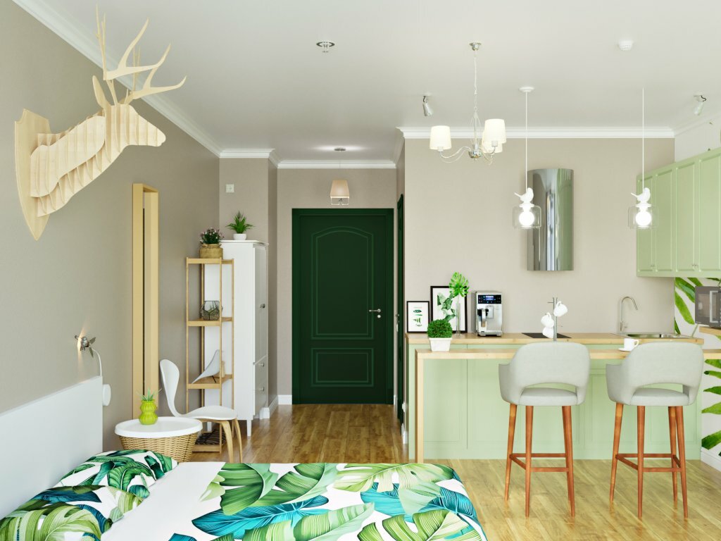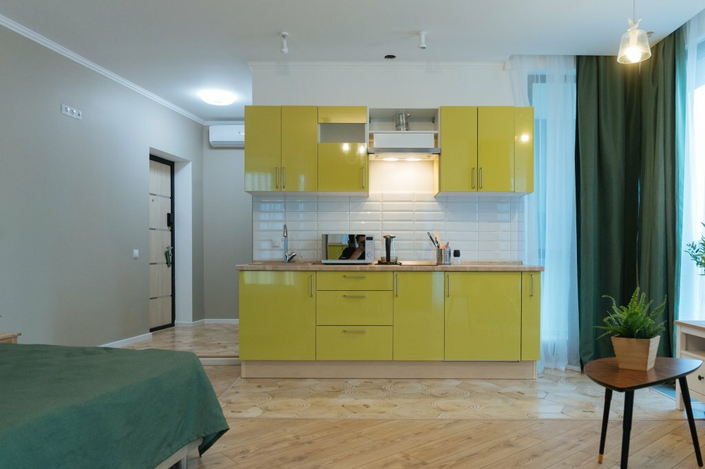 - Наличие кухонной зоны с посудой и техникой (плита, микроволновка, чайник).