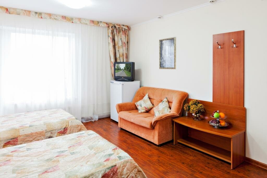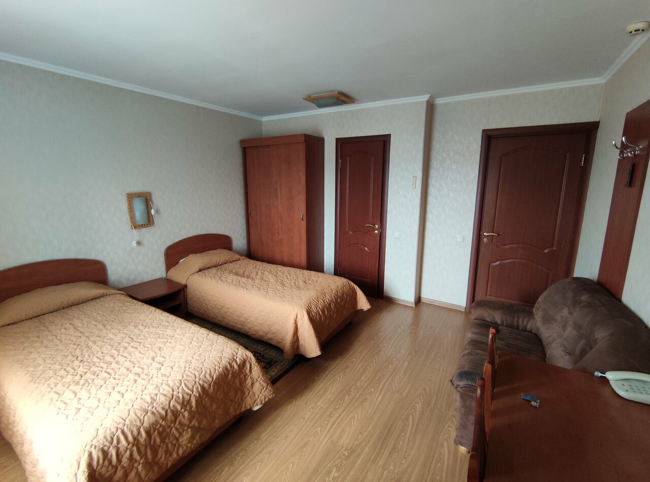 номер'Стандарт' с двухспальной кроватью и доп. местом(тахта),в номере есть санузел(унитаз,душ),телевизор,холодильник,чайный столик. Ребенок до 5 лет размещается бесплатно без предоставления места.