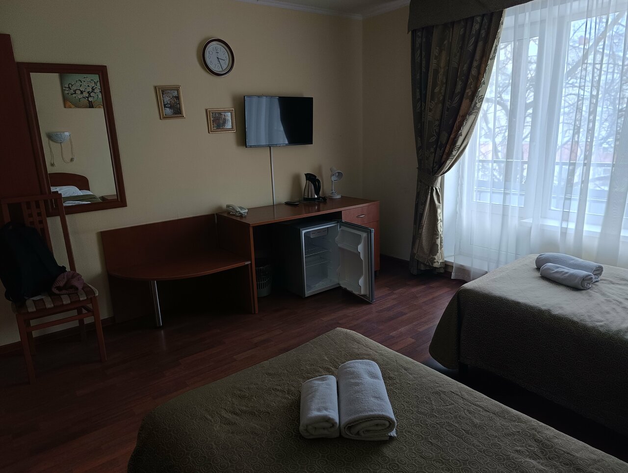 Хорошие чистые номера, удобное расположение) но не во всех номерах есть фен, некоторые номера с общим санузлом, убранство тоже очень скромное, телевизор плохо работает