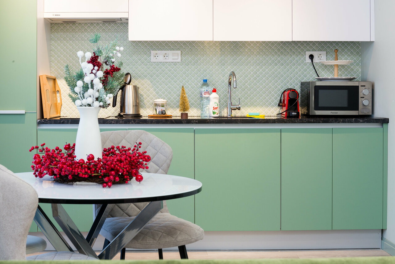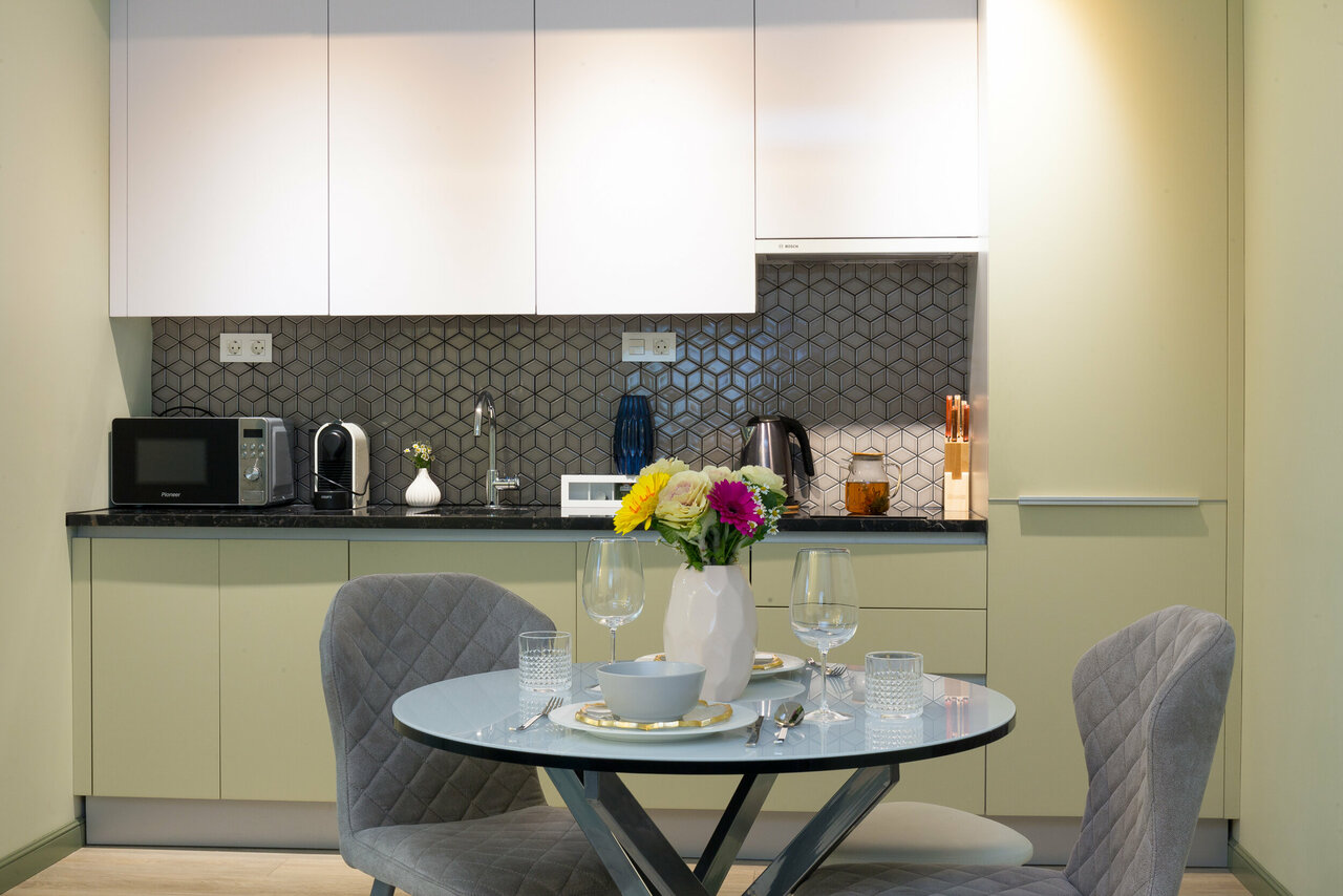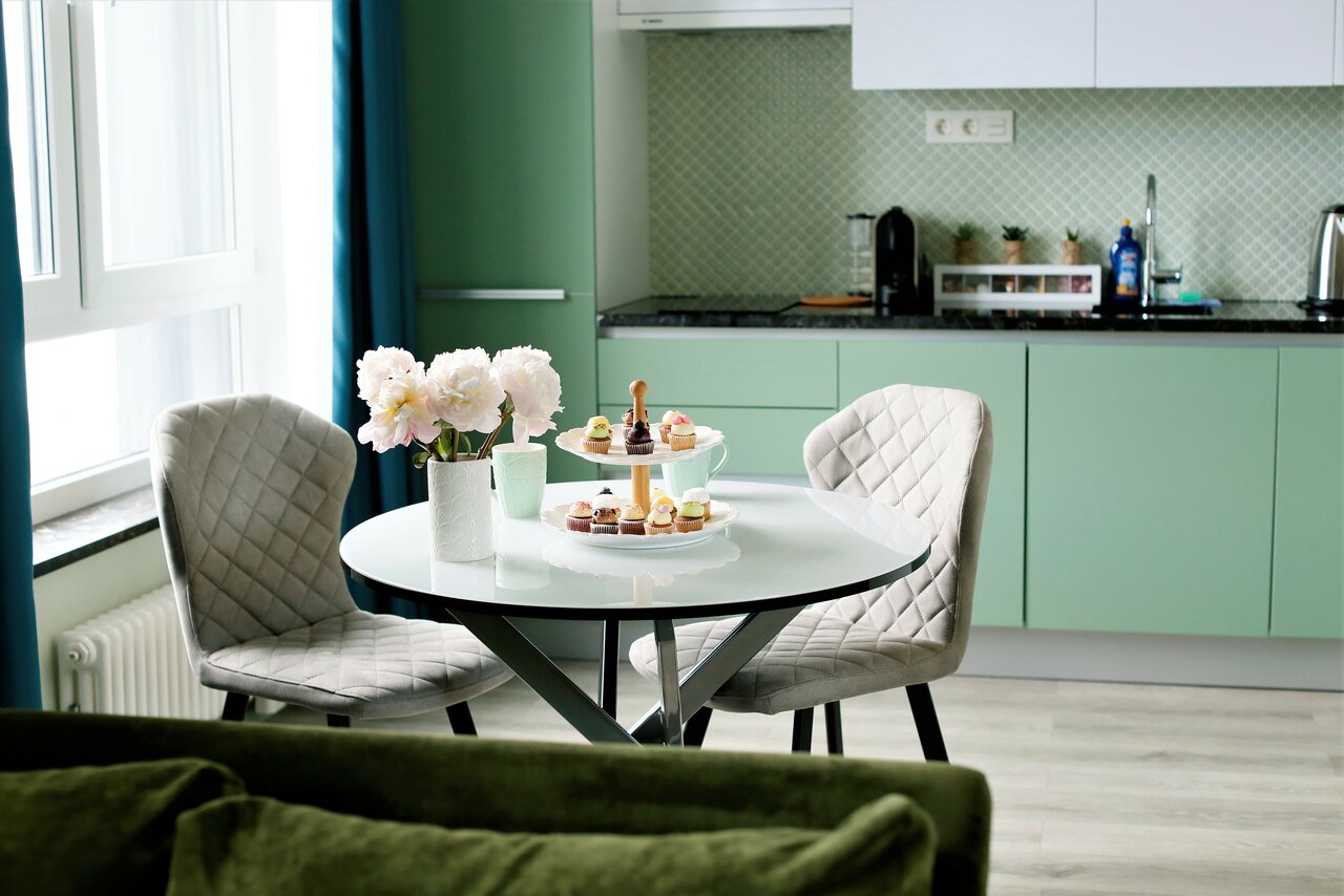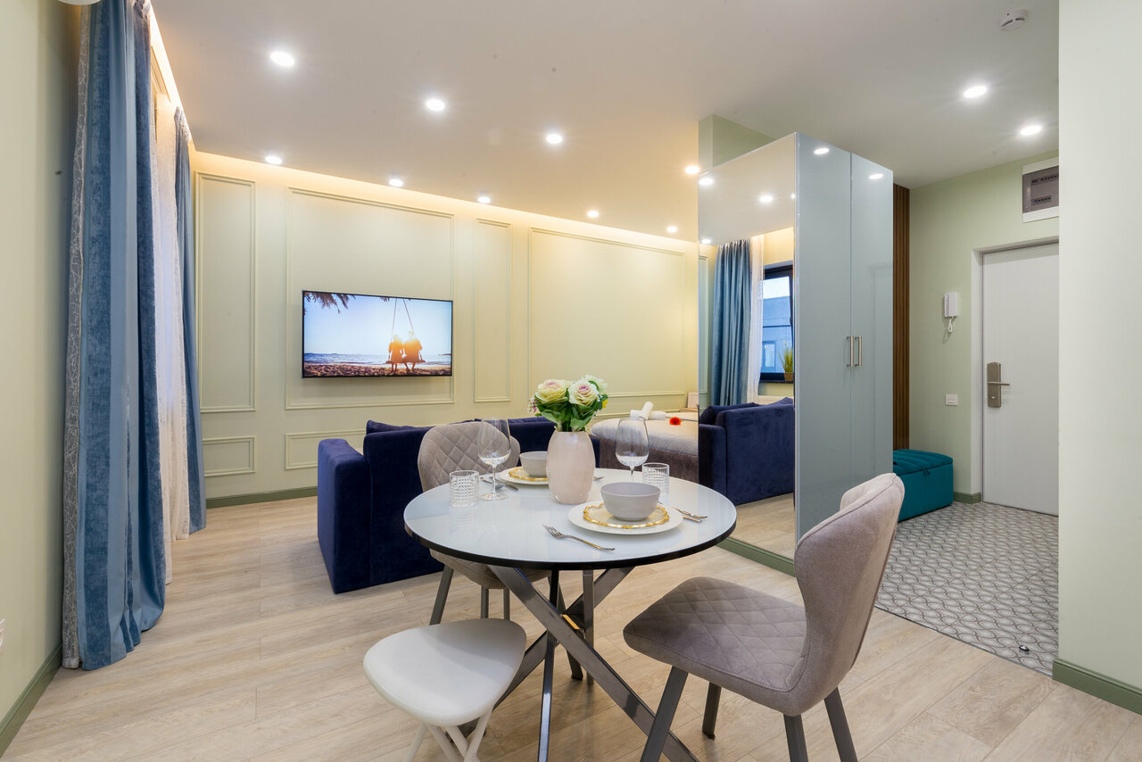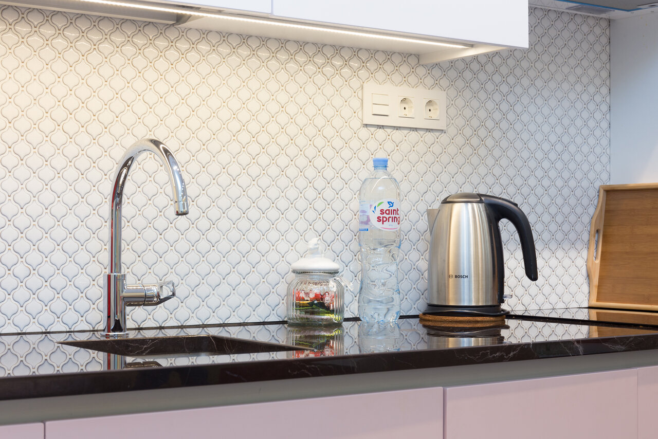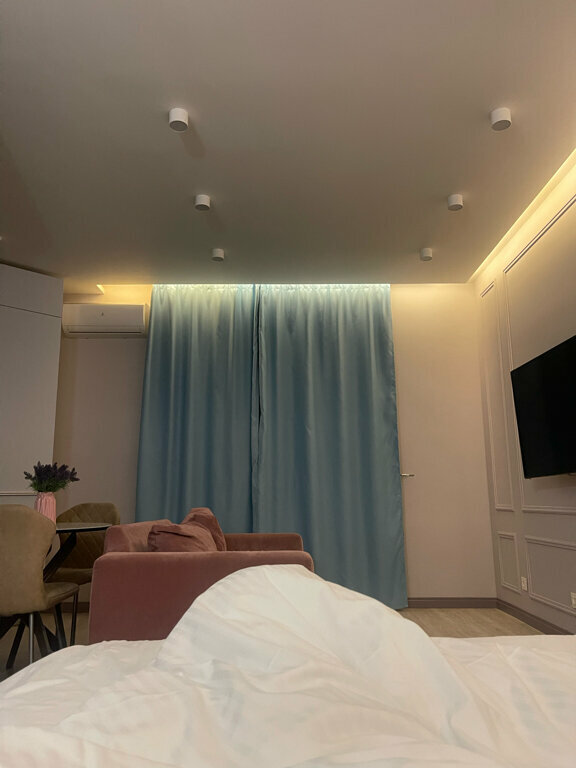 Очень уютные апартаменты. Есть вся кухонная утварь, капсульная кофемашина. Телевизор оставаться одно удовольствие. Из минусов только то, что не было сахара что бы выпить кофе утром. Очень удобно что в трех минутах Ашан. Отношение администраторов порадовало. Как и сервис в целом. Спасибо за гостеприимство будем оставаться ещё