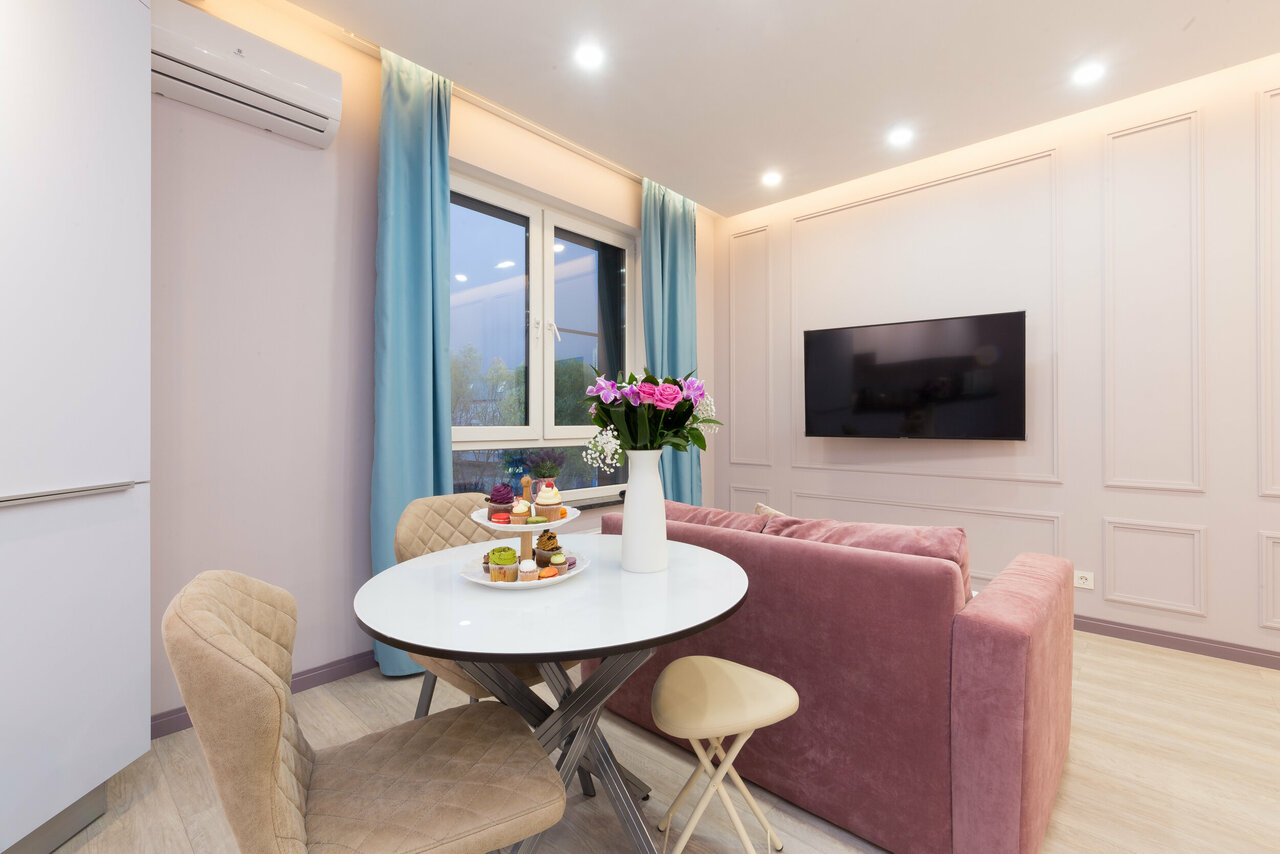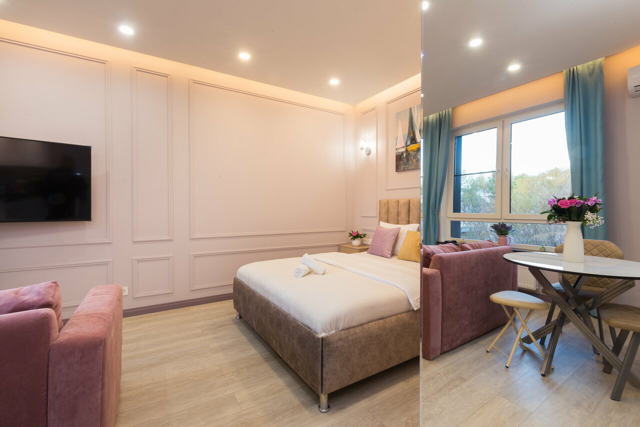 Предлагаем невероятно уютный апартамент в розовых тонах, которые помогут Вам максимально отдохнуть от серых будних или выходных. Устройте себе праздник души! Все остальные заботы доверьте нам Ждём Вас в гости!