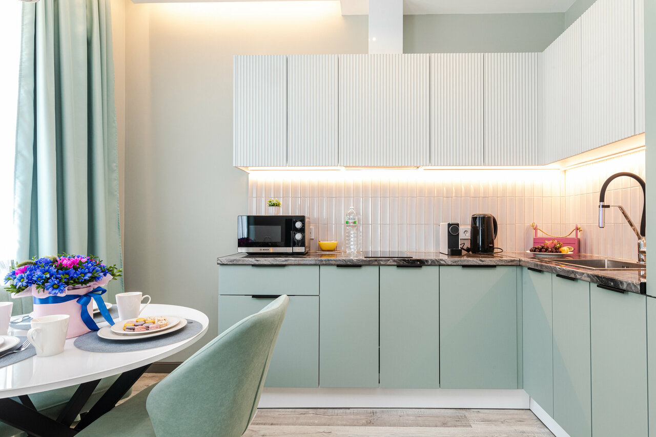 Уважаемые гости! К Вашему вниманию невероятно уютный, красивый и стильный апартамент в нежно бирюзовых оттенках. Идеально для семейных, дружеских встреч или если хочется просто сменить обстановку на что-то стильное. Мы постарались сделать уютное п...