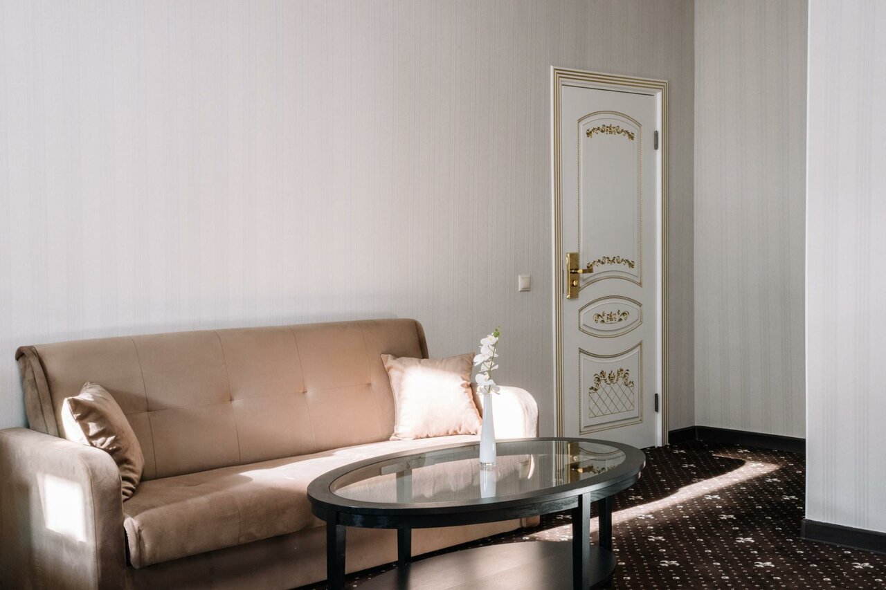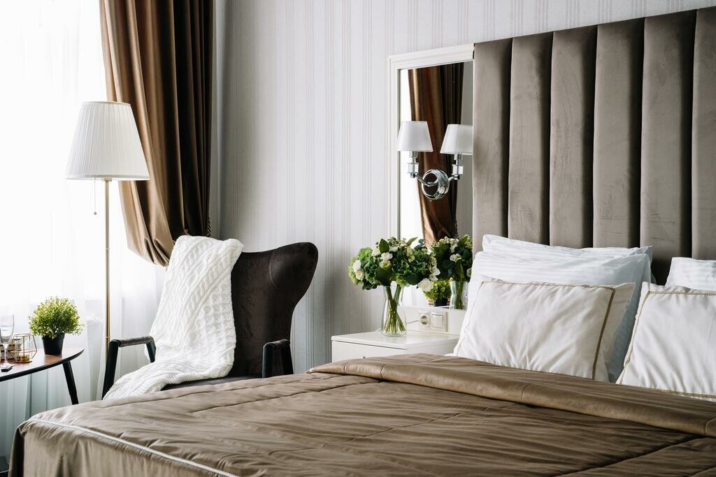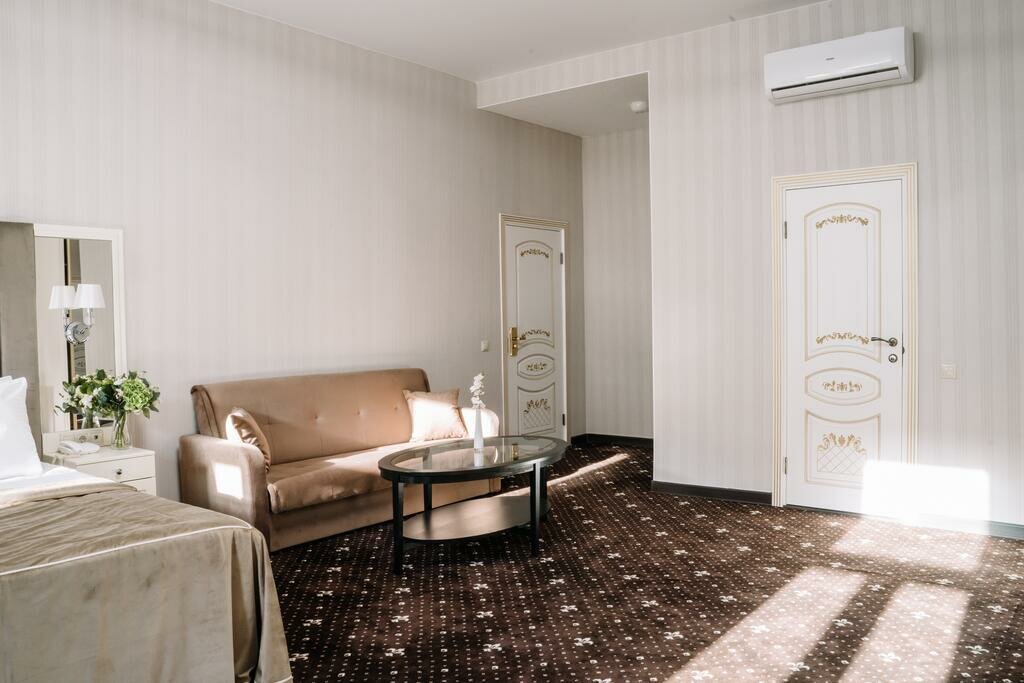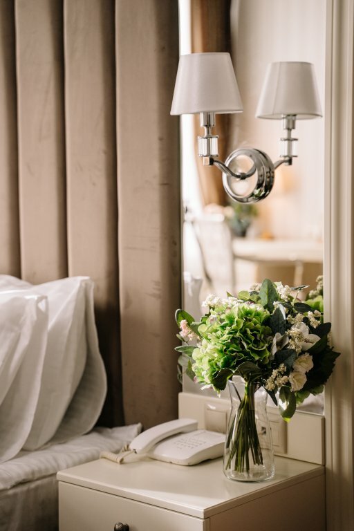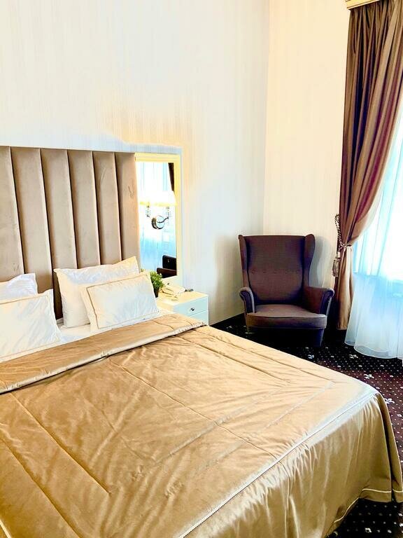 Номер 'Люкс' - однокомнатный роскошный номер, площадью 50 кв. метров c одной кроватью King-size. В номере есть все необходимое: рабочая зона, бесплатный WIFI, набор для приготовления чая, отдельная ванная комната с банными принадлежностями.