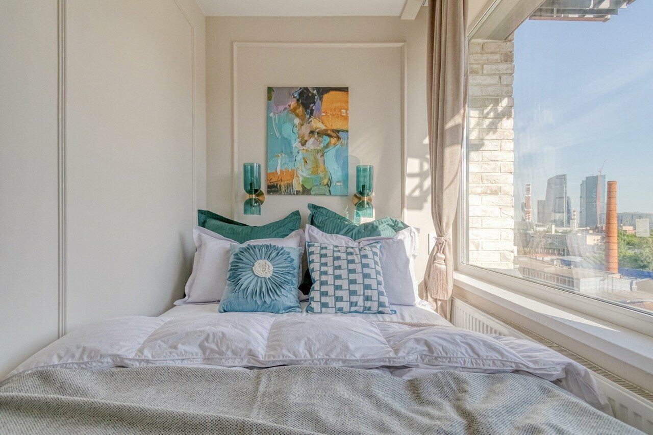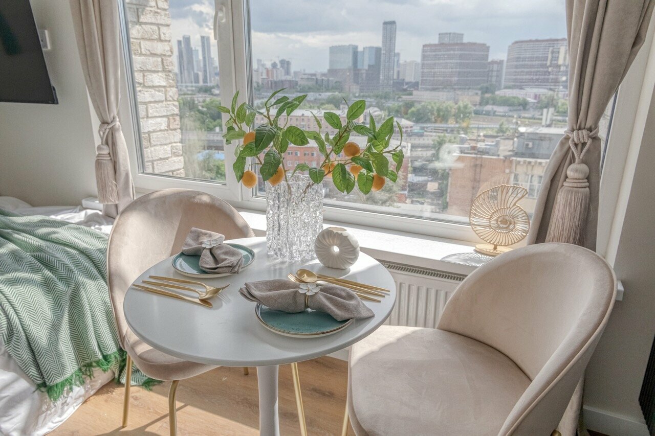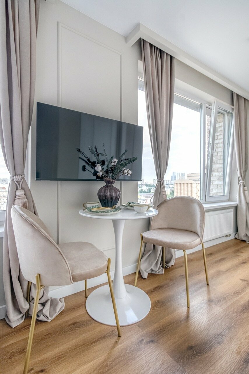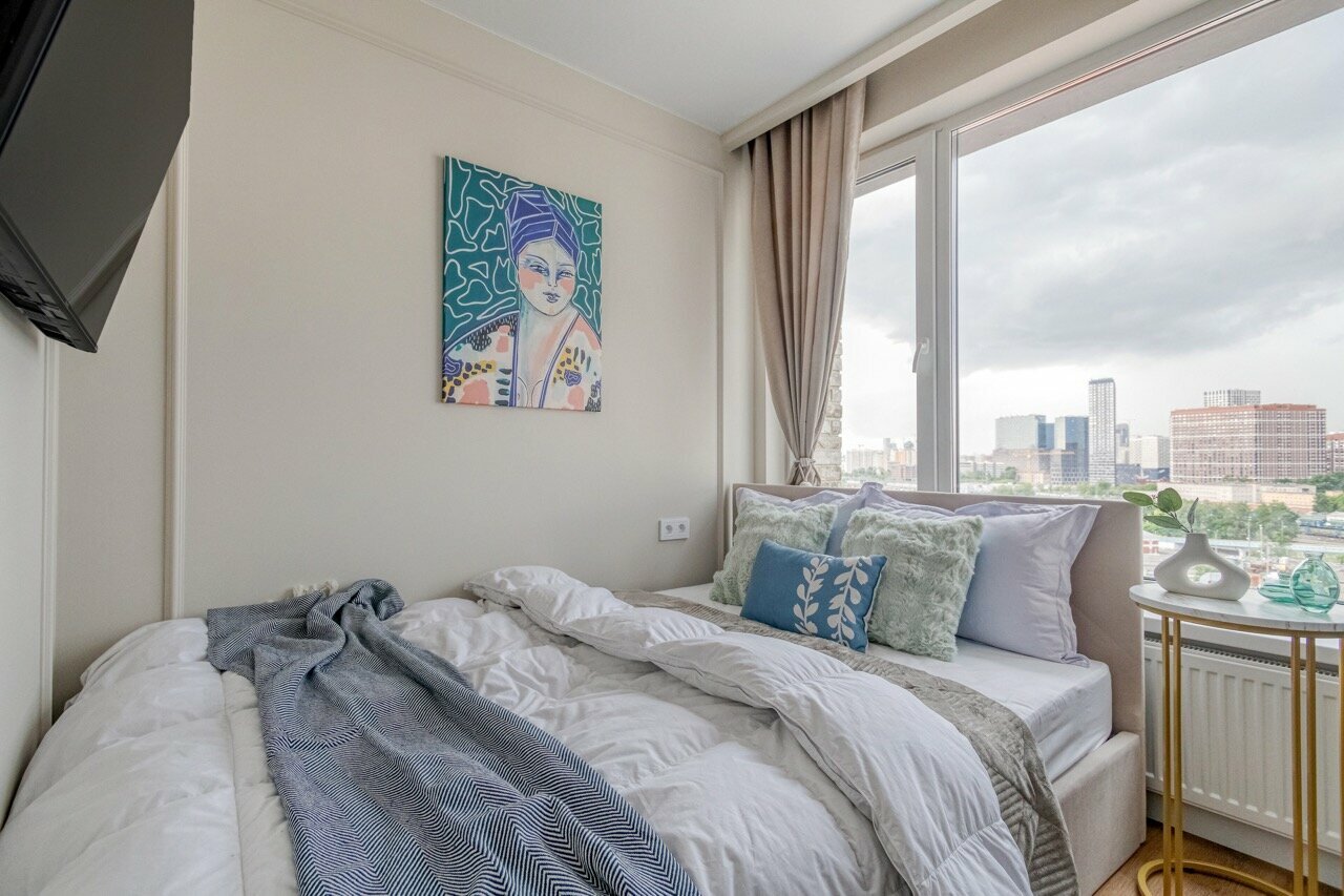 Стильная уютная студия в ЖК 'Мята'. Метро Хорошевская (10 минут пешком)Большие окна. Качественная дорогая мебель и техника. Интерьер продуман до мелочей. В квартире есть все необходимое для проживания 2-х человек.