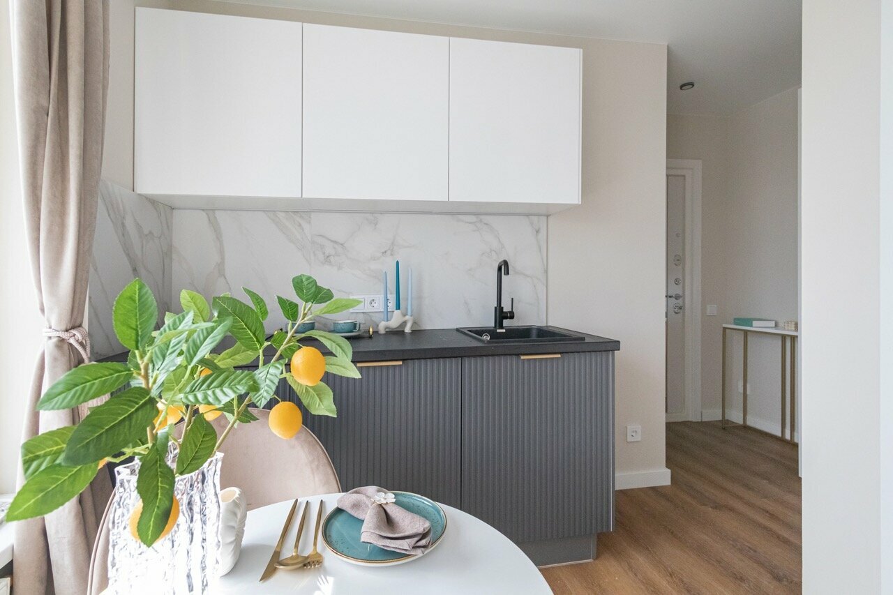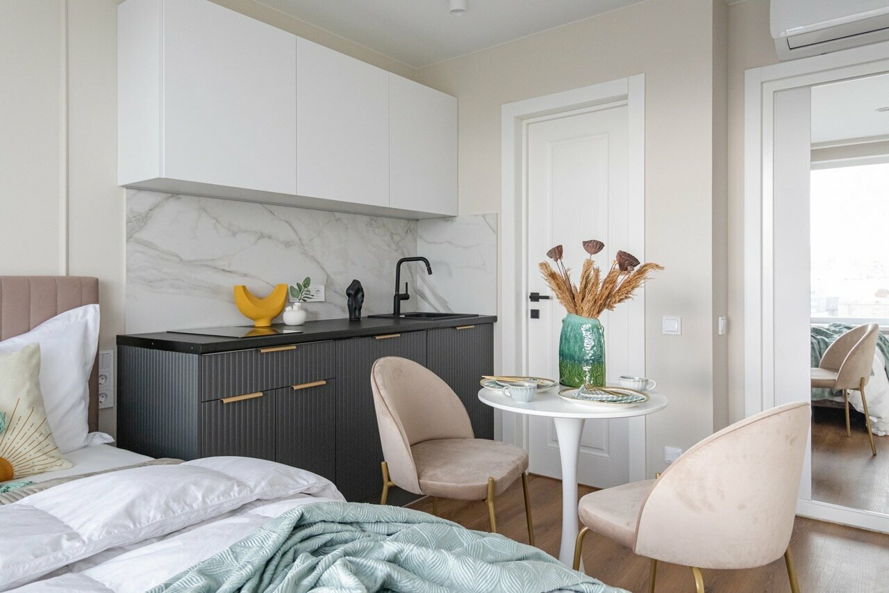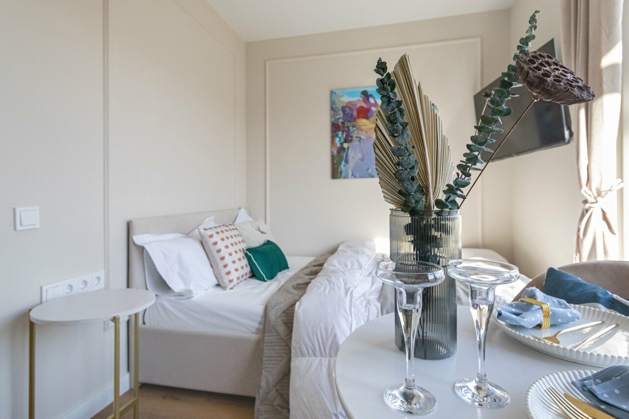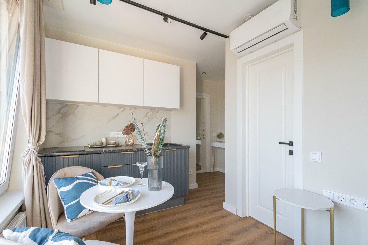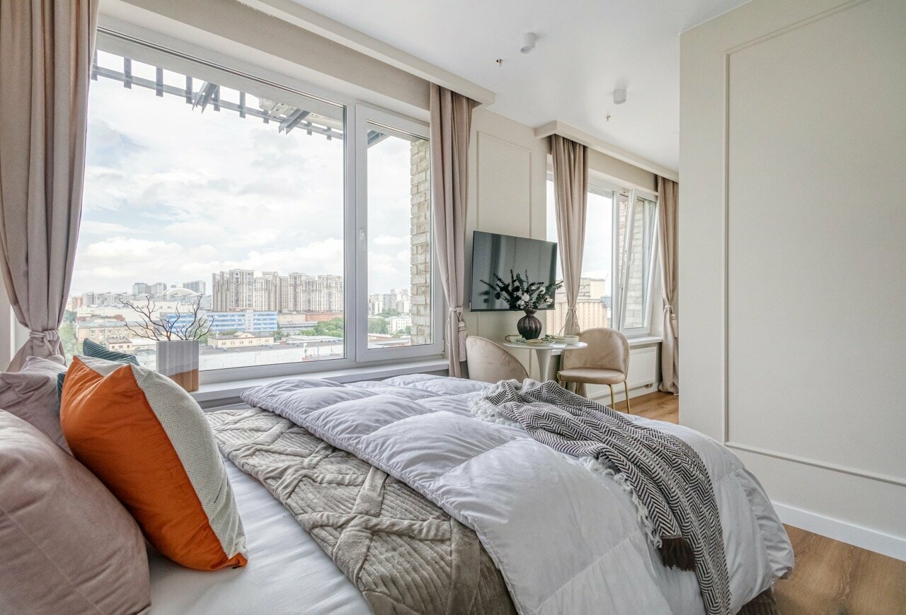 Стильная уютная студия в ЖК 'Мята'. Метро Хорошевская (10 минут пешком)Большие окна. Качественная дорогая мебель и техника. Интерьер продуман до мелочей. В квартире есть все необходимое для проживания 2-х человек.