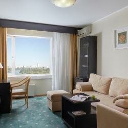 Роскошный двухкомнатный номер, состоящий из небольшой прихожей, просторной ванной комнаты, гостевого туалета, гостиной с мягкой мебелью и спальни. Изысканный дизайн дополняется удобной мебелью, оборудована зона отдыха с чайником и кофемашиной.