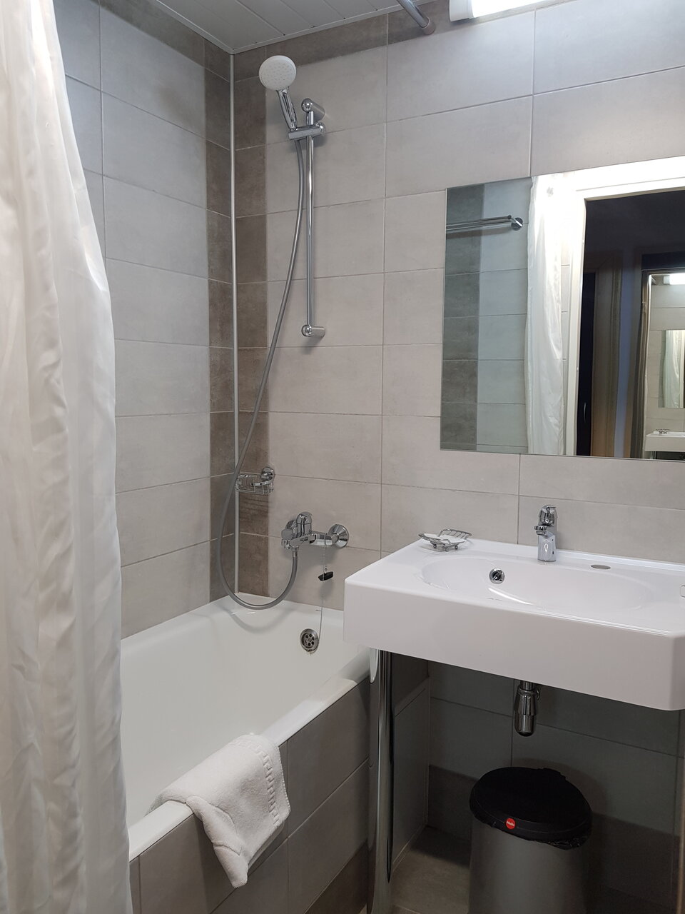 Отдыхали здесь, тихо, симпатично, уютно, чисто, всё понравилось! Есть одноразовые тапочки, ванно-банные принадлежности, телевизор транслирует множество каналов, кровать удобная, постельное бельё чистое, если окно закрыто, то даже жарко, достаточно тихо, соседей слышно не было, единственное что — когда открываешь окно, то со стороны СВХ слышны звуки автомобилей, а так в целом, всё прекрасно! Доставка в номер не работает, к сожалению, как указано на буклете Доставка в номер 24/7, но это не страшно, на 1 этаже множество разных ресторанов и кафе, мы позавтракали в Матрёшке, завтраки там просто супер! С радостью бы заселились сюда ещё раз!