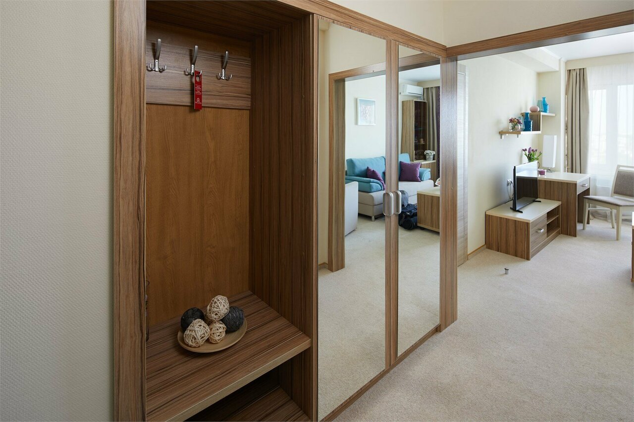 Элегантный двухкомнатный номер, состоящий из небольшой прихожей, ванной комнаты, гостевого туалета, гостиной и спальни. В номере оборудована зона отдыха с чайником и кофемашиной, а также организовано рабочее пространство с письменным столом.