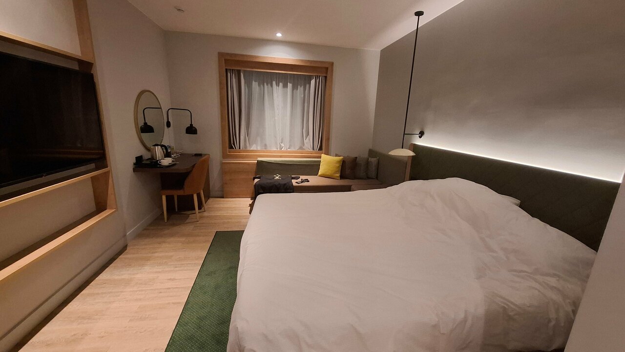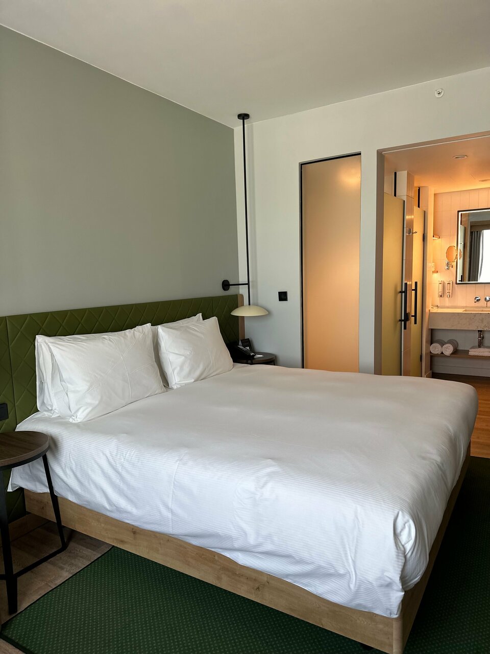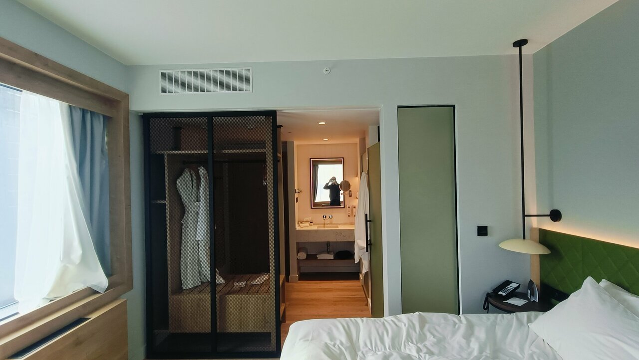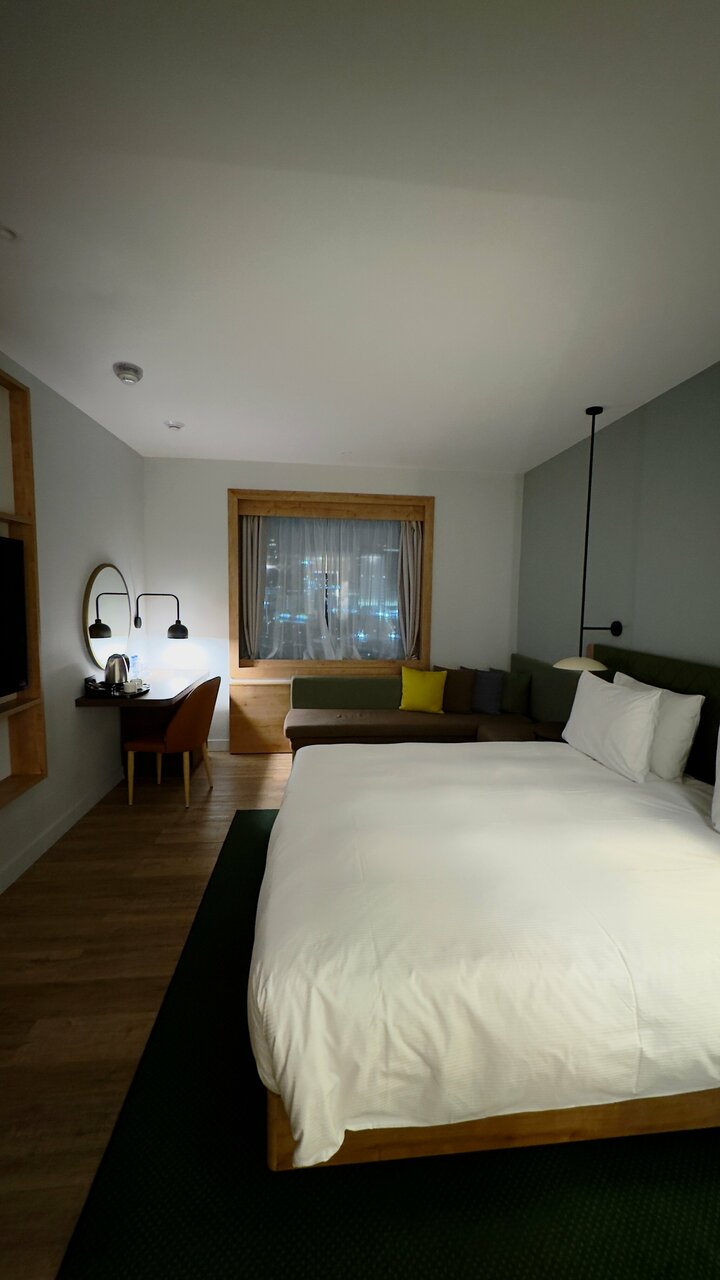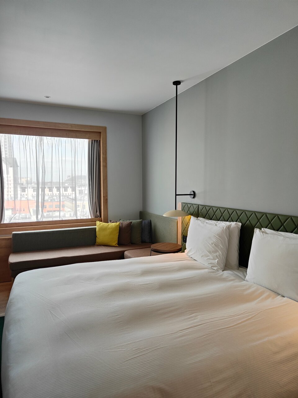 Отель открылся совсем недавно и ранее планировался как отель сети Hilton Garden Inn, поэтому и планировка номера сделана в соответствии со стандартами этой сети, которые действовали на момент строительства отеля. Окна моего номера выходили на оживленную улицу, при этом было довольно тихо, и шторы с хорошим затемнением тоже плюс.
