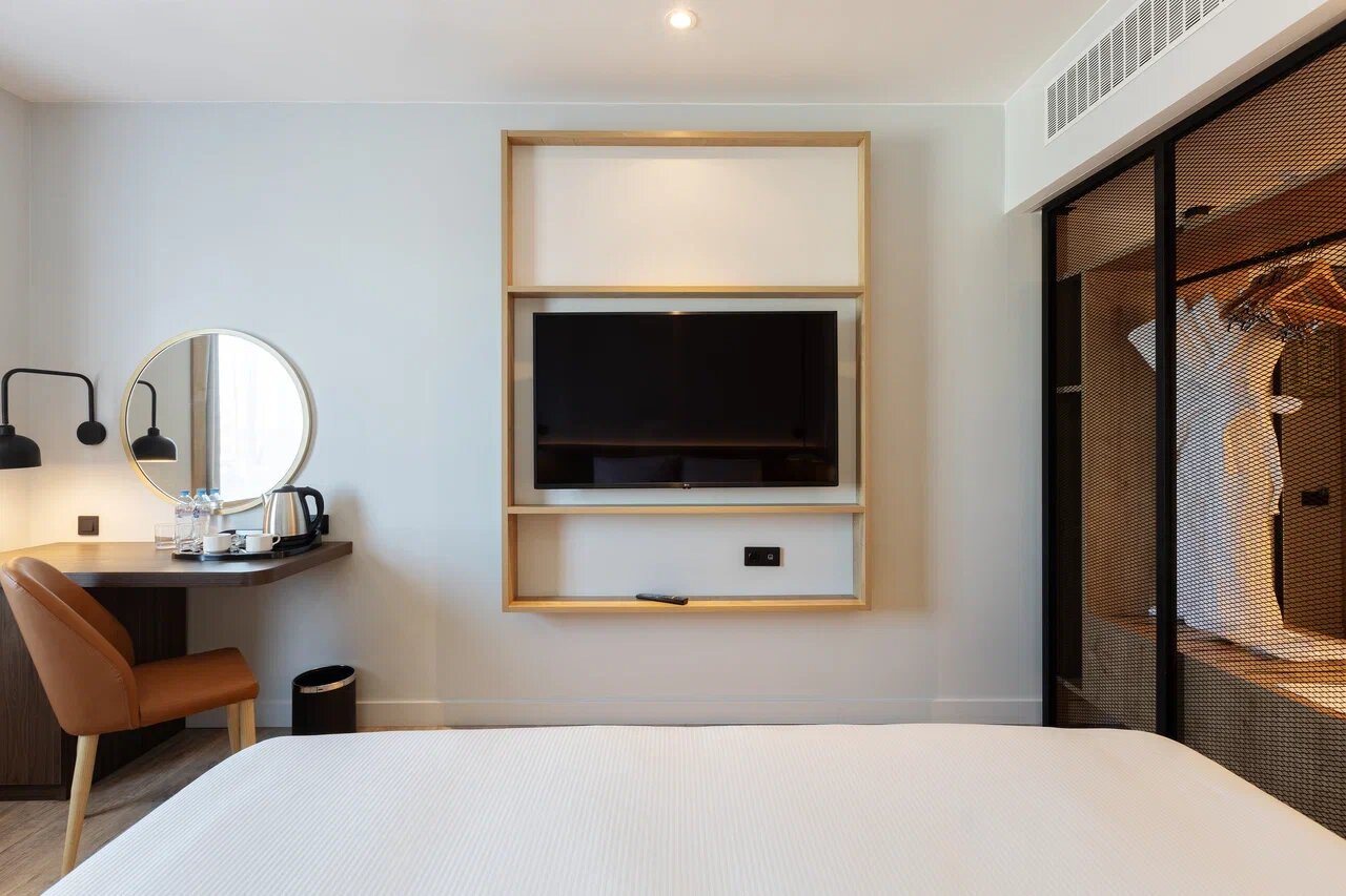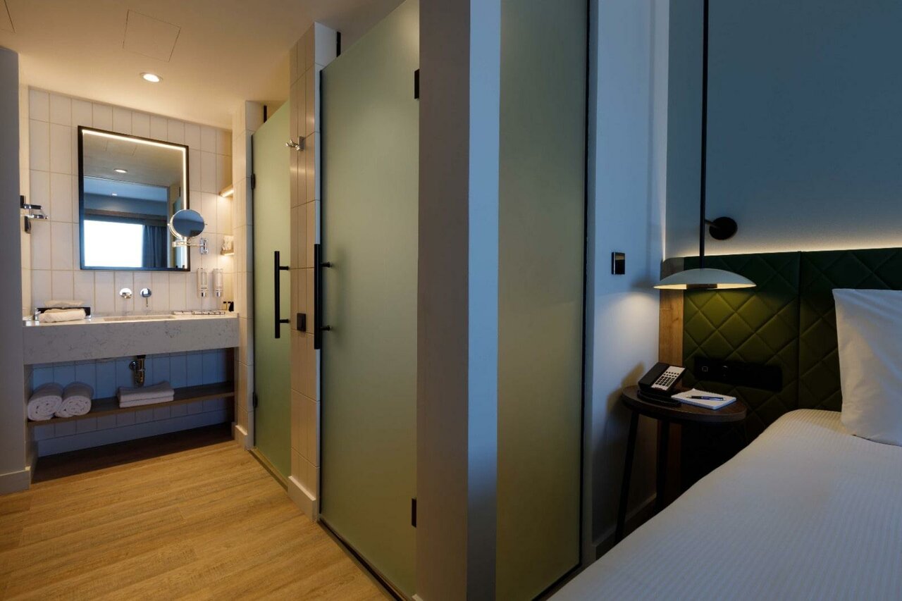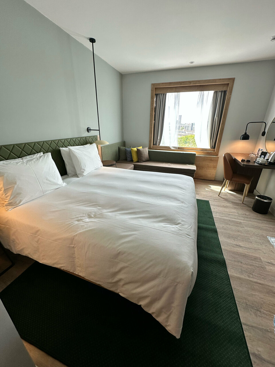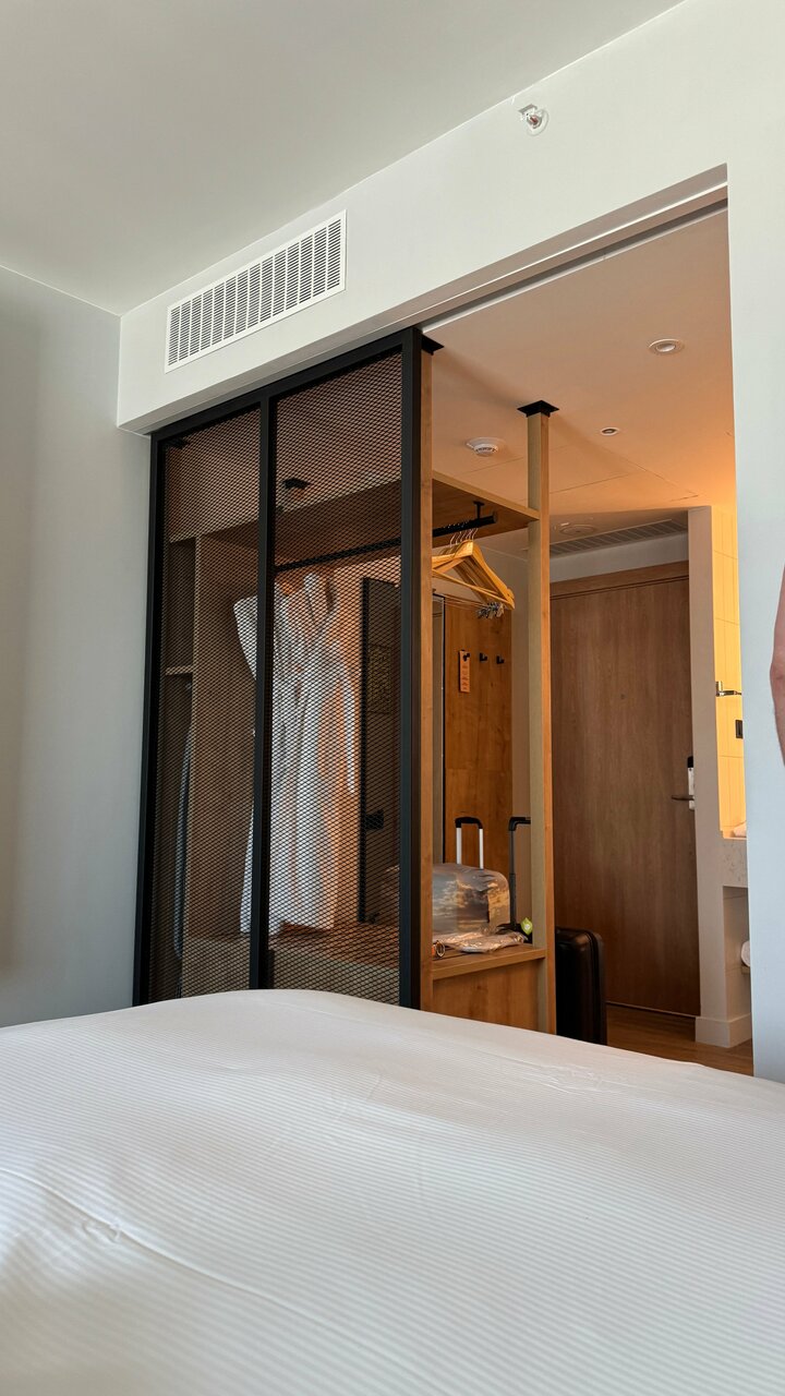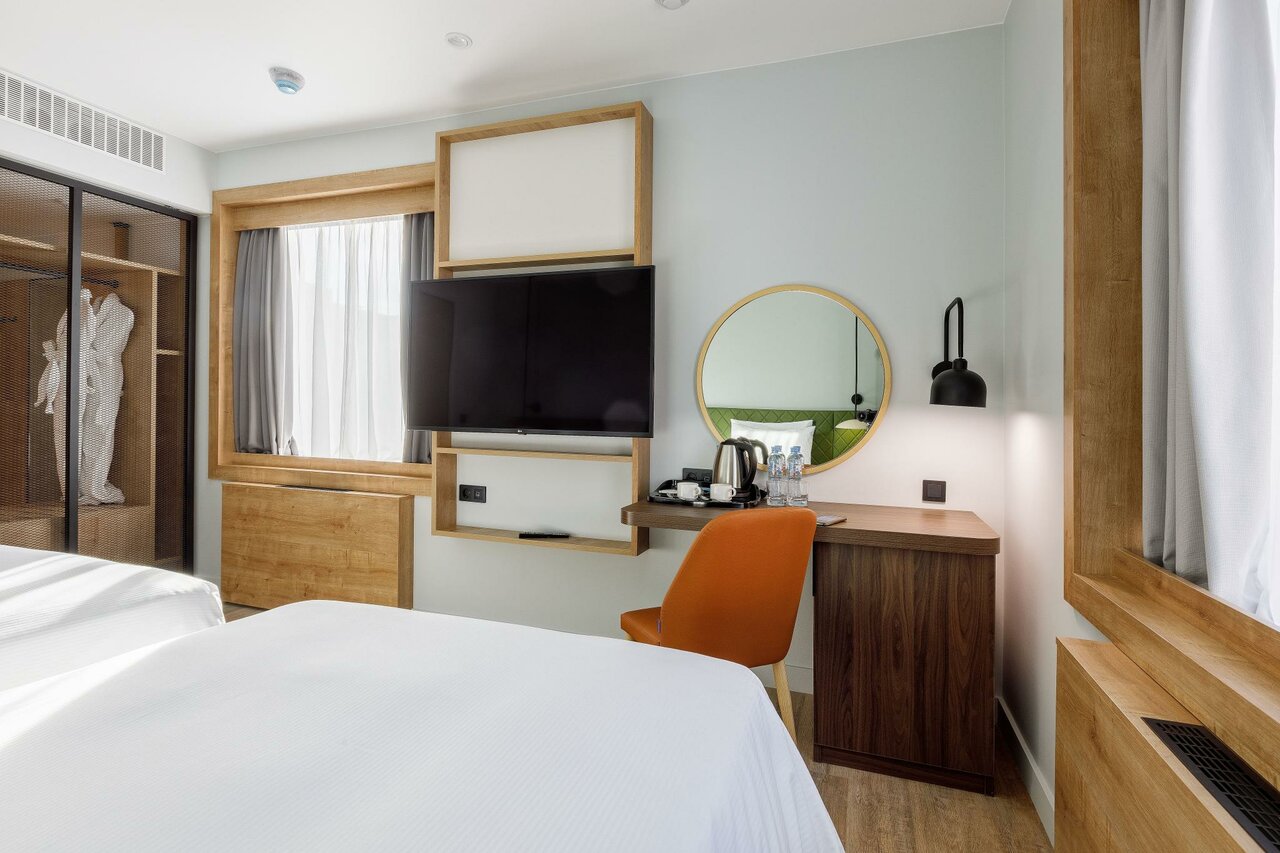 Отель открылся совсем недавно и ранее планировался как отель сети Hilton Garden Inn, поэтому и планировка номера сделана в соответствии со стандартами этой сети, которые действовали на момент строительства отеля. Окна моего номера выходили на оживленную улицу, при этом было довольно тихо, и шторы с хорошим затемнением тоже плюс.