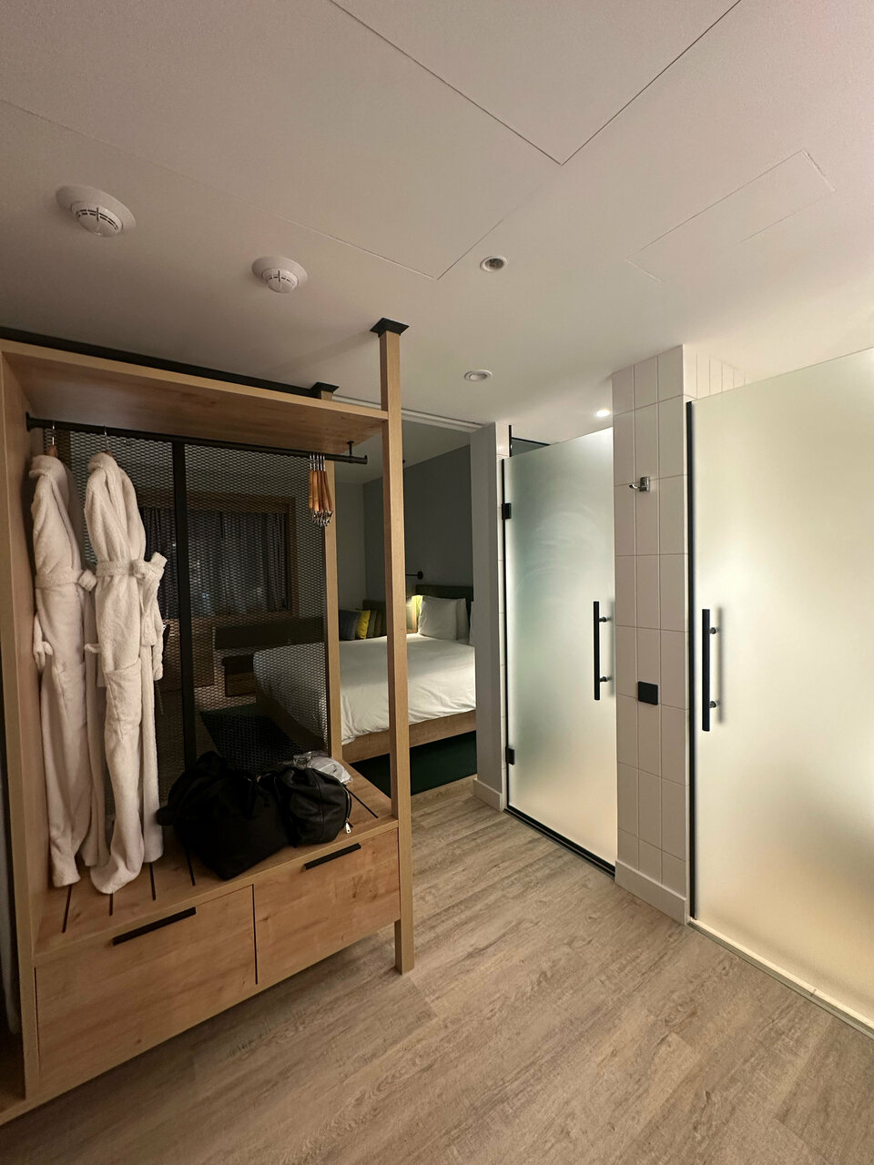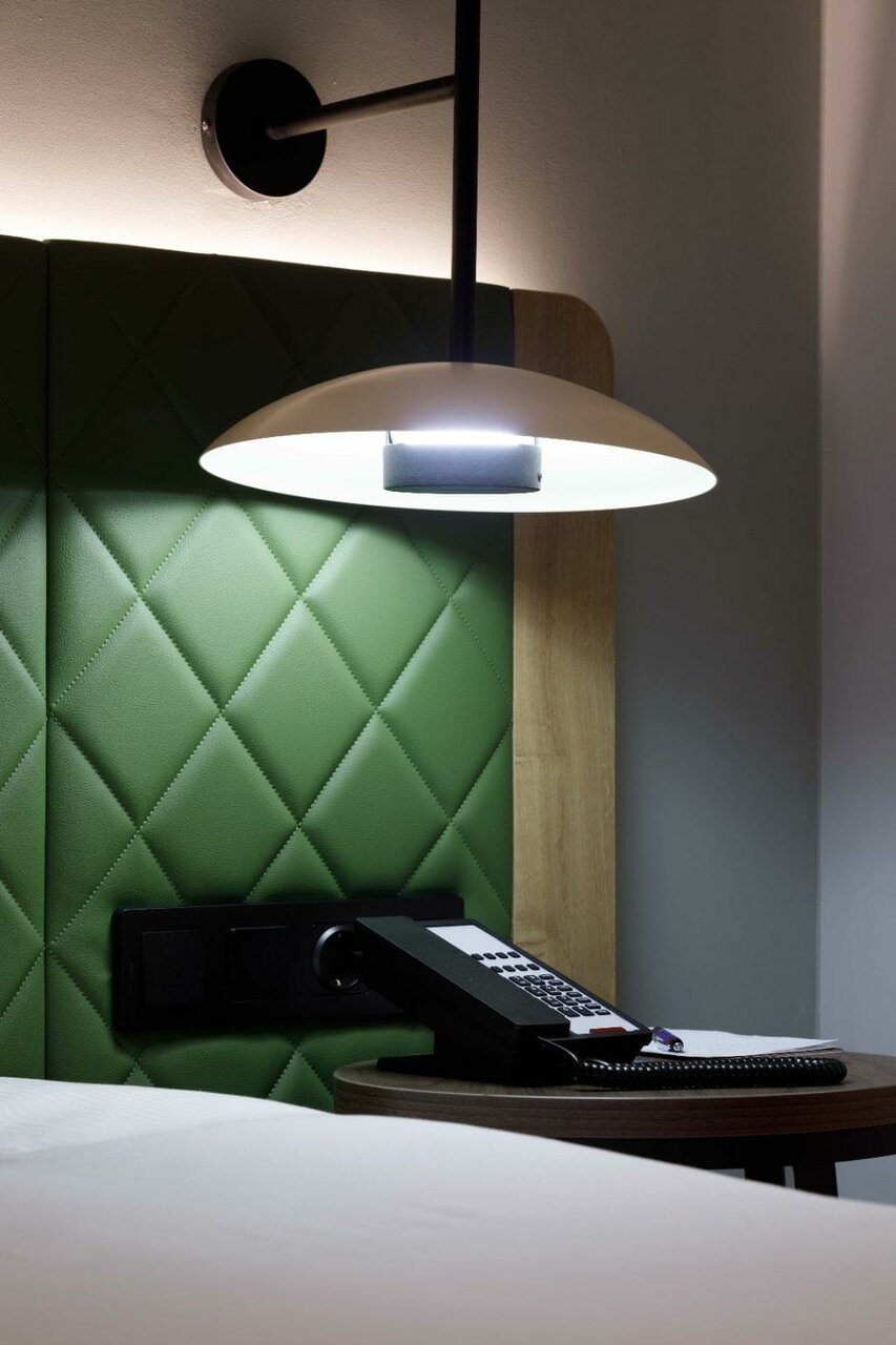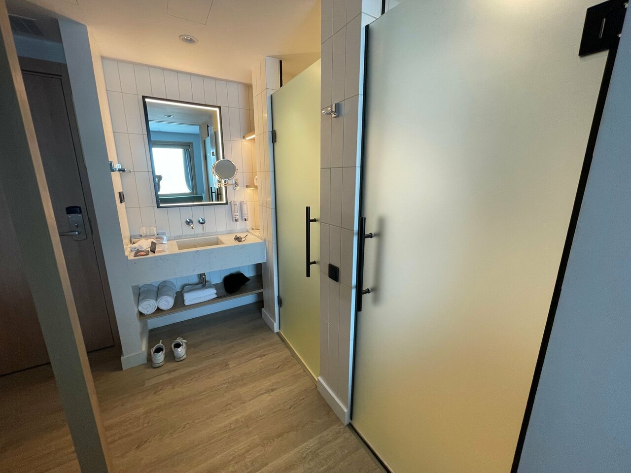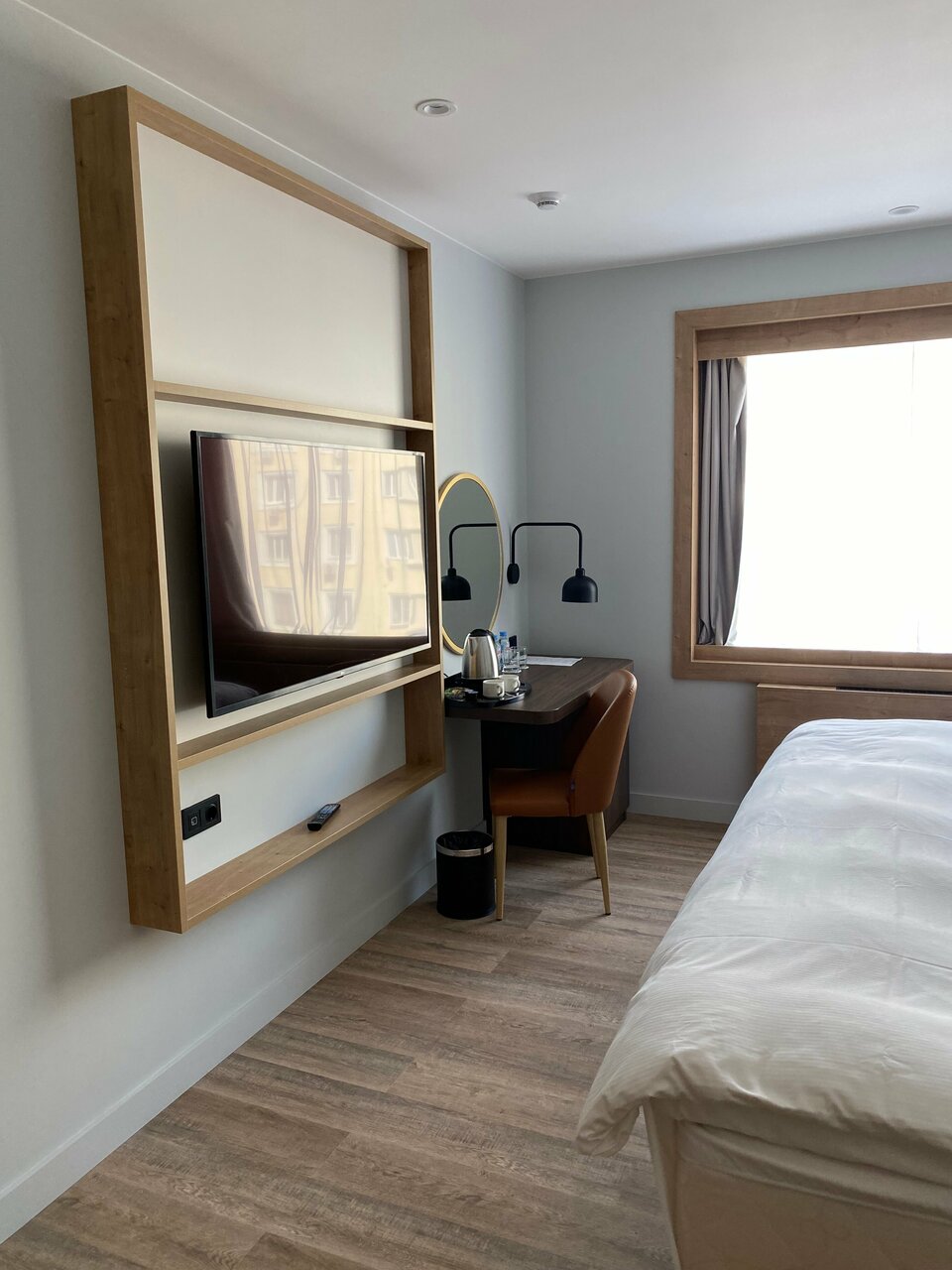 Отель открылся совсем недавно и ранее планировался как отель сети Hilton Garden Inn, поэтому и планировка номера сделана в соответствии со стандартами этой сети, которые действовали на момент строительства отеля. Окна моего номера выходили на оживленную улицу, при этом было довольно тихо, и шторы с хорошим затемнением тоже плюс.