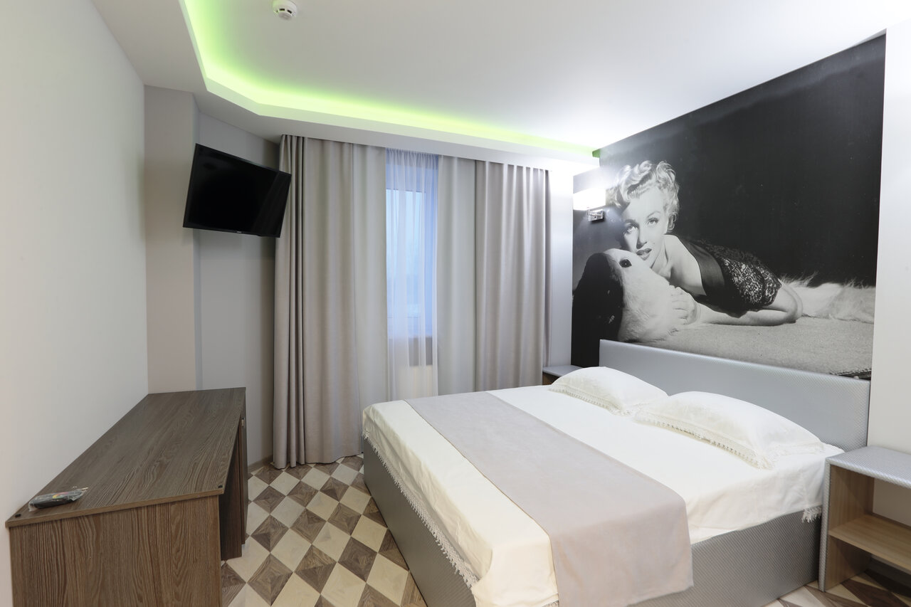 Двухместный номер площадью 18 кв.м. Шумоизоляция стен и дверей Двух спальная кровать King Size TV (Smart) WiFi (бесплатный) Кондиционер (с функцией обогрева) Мини-бар Стол, стулья Посуда Душ. кабина