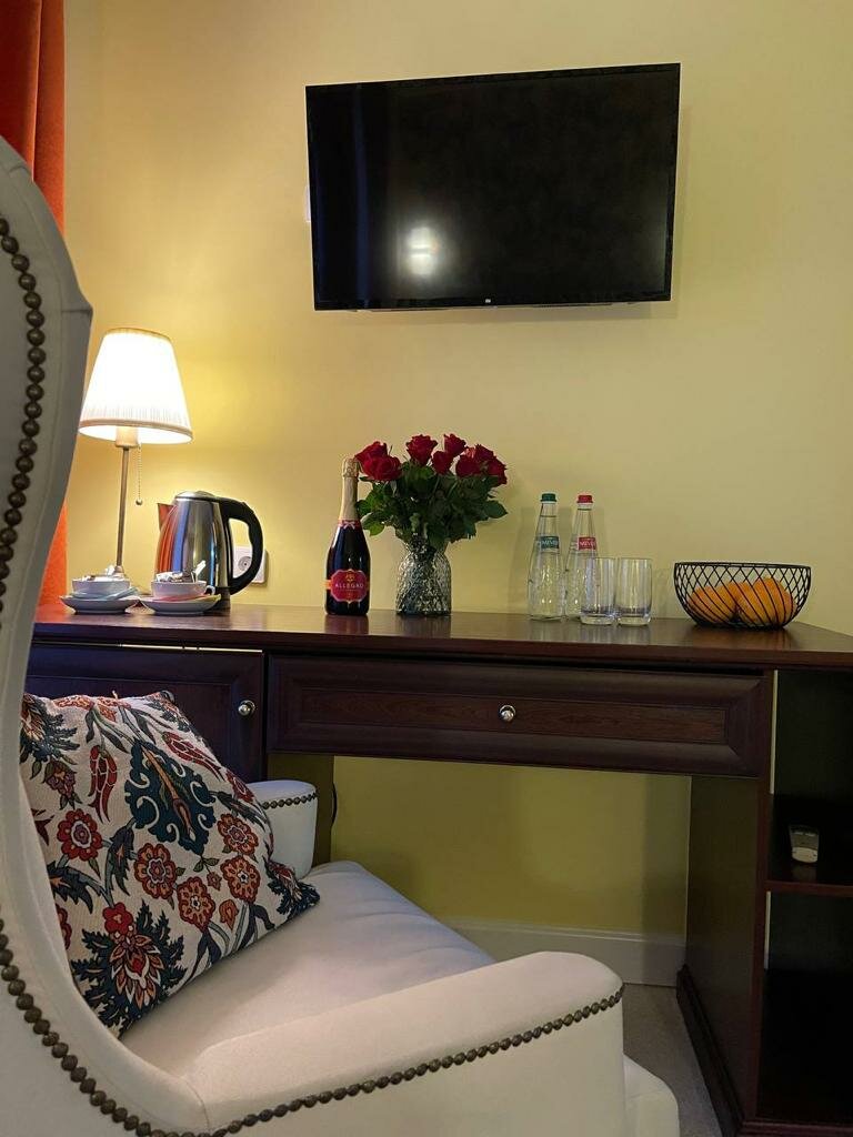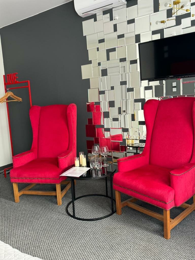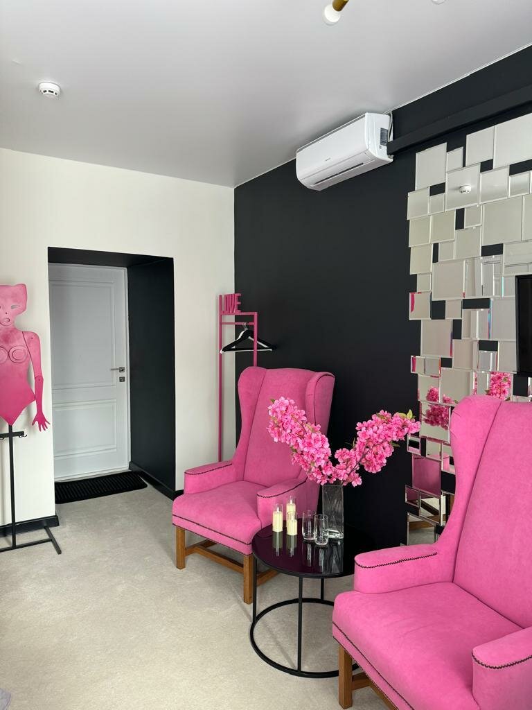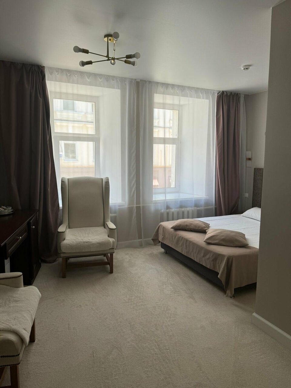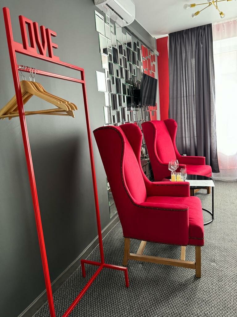 В номере находится собственная ванная комната, двуспальная кровать, прикроватные столики, письменный стол, два кресла, телевизор, мини холодильник, банные принадлежности, зубной набор, халат, тапочки.2 часа - 3000р.