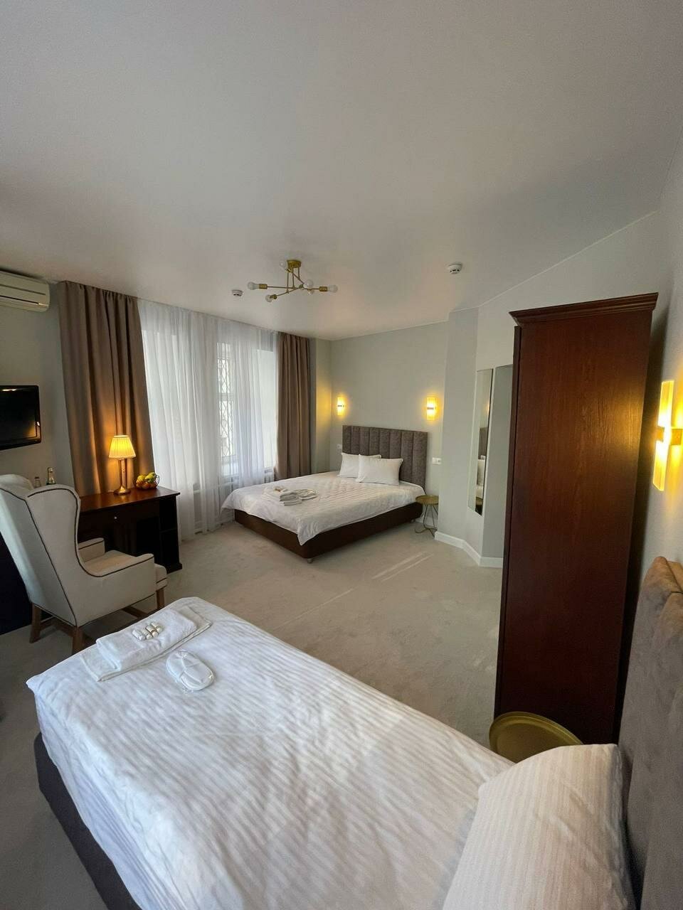 Номер с общей ванной комнатой на два номера. Комфортабельный и просторный номер с одной двухспальной кроватью и одной одноместной. Шторы с полным затемнением. Дополнительная детская кроватка для детей до 3 лет бесплатно.