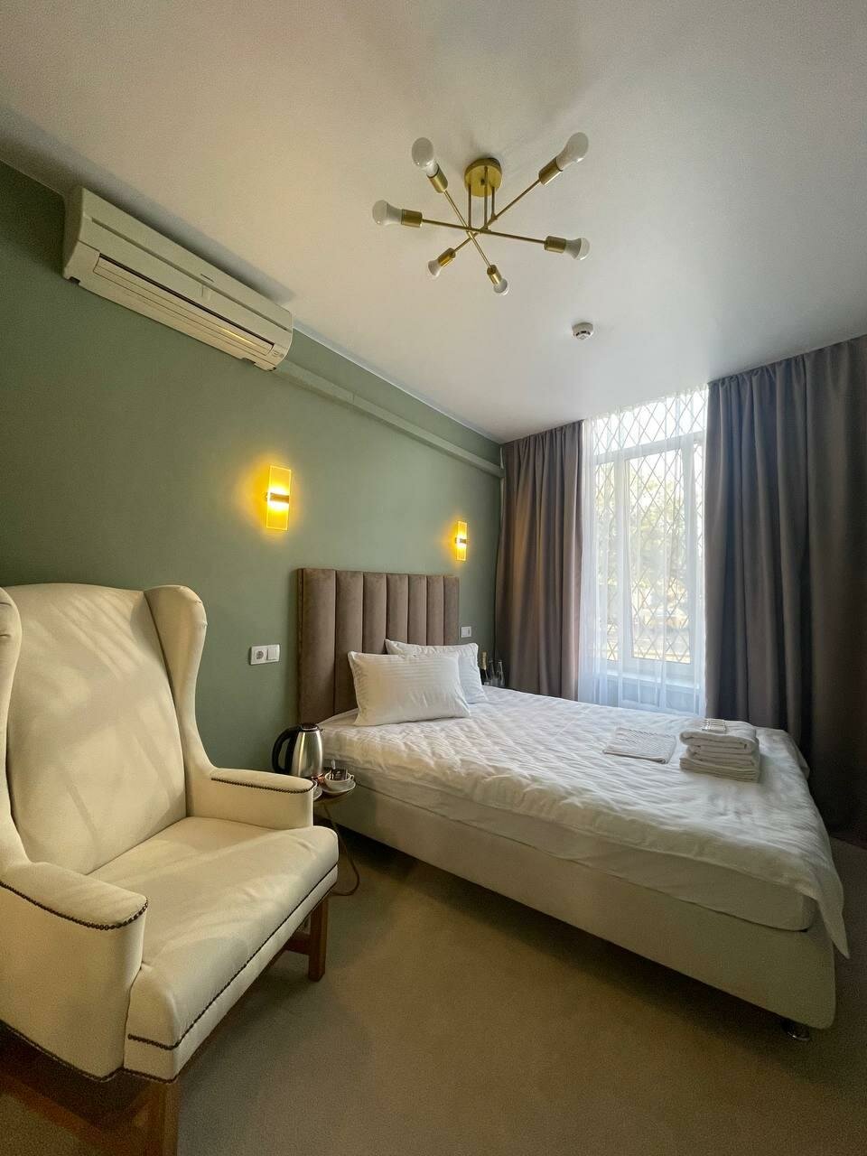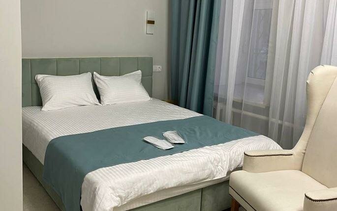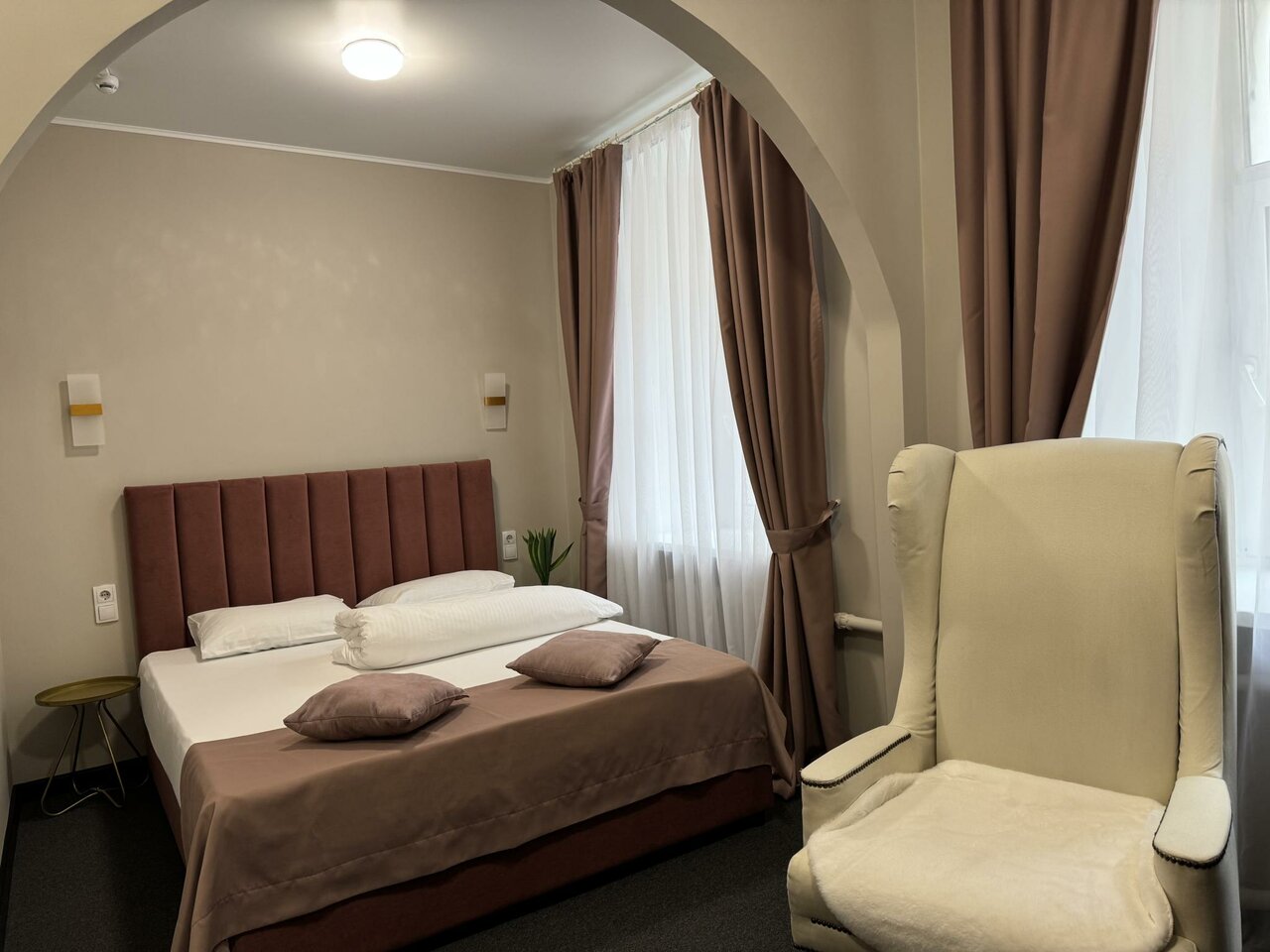 В номере располагается двуспальная кровать, шкаф, мини холодильник, кресло.