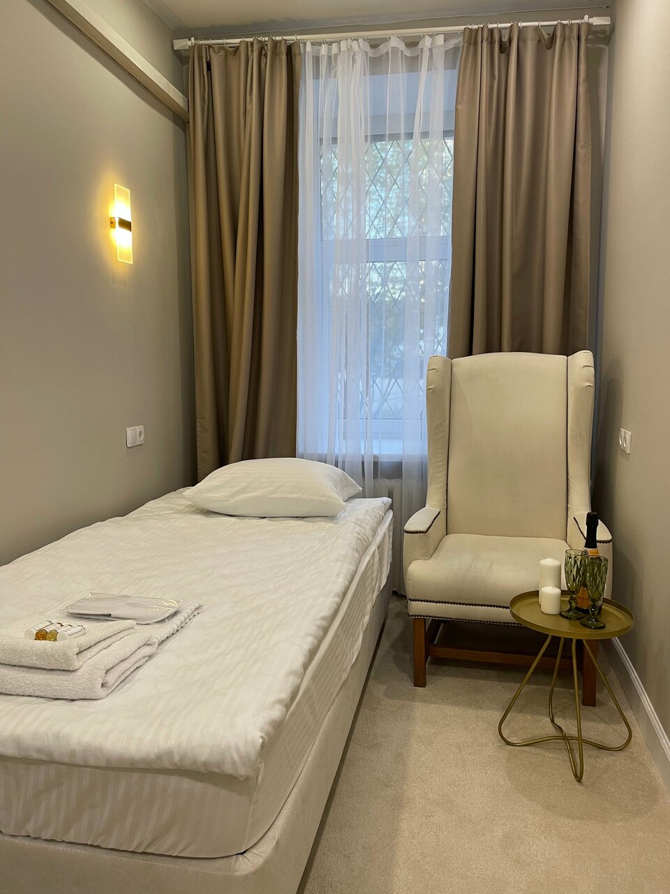 В номере располагается односпальная кровать, тумбочка, мини холодильник, шкаф для одежды. Полный санузел расположен на этаже для трёх одноместных номеров. Данный номер отлично подходит для гостей, которые готовы делить санузел с соседом. 3400руб ...