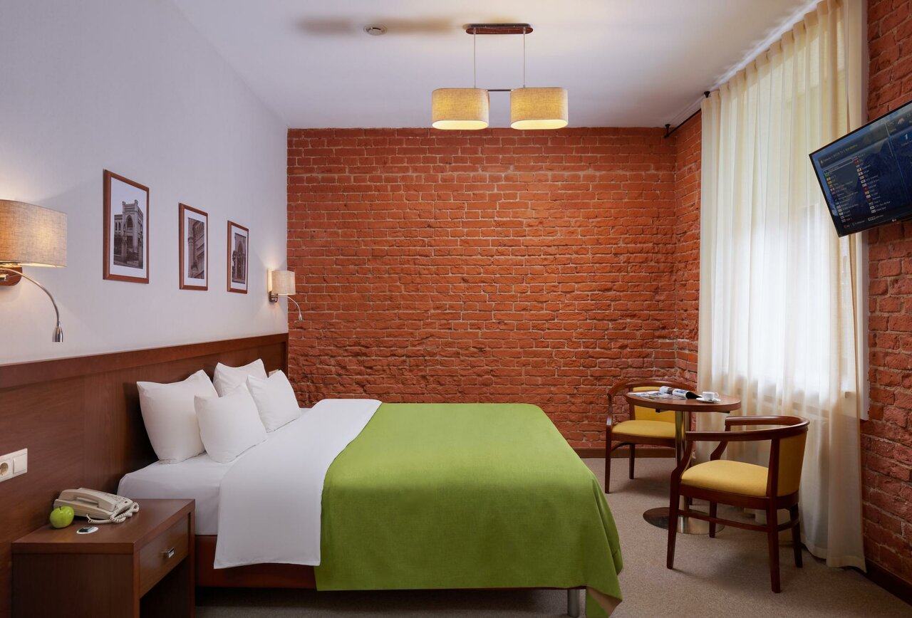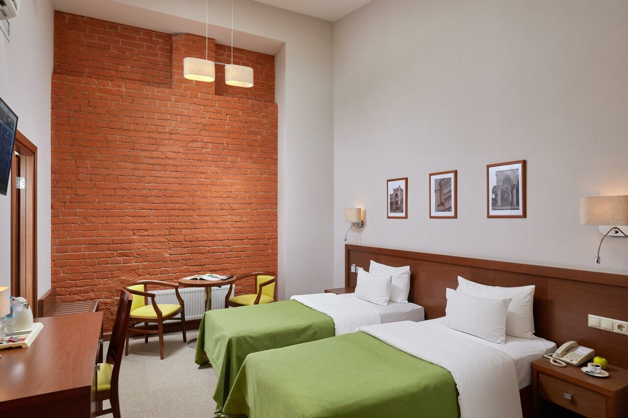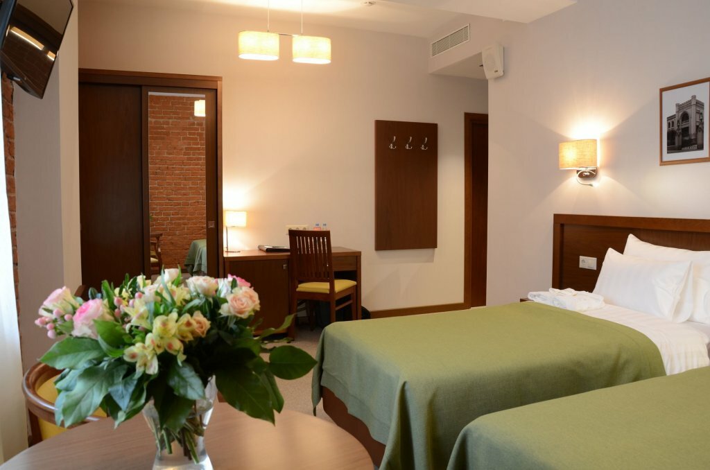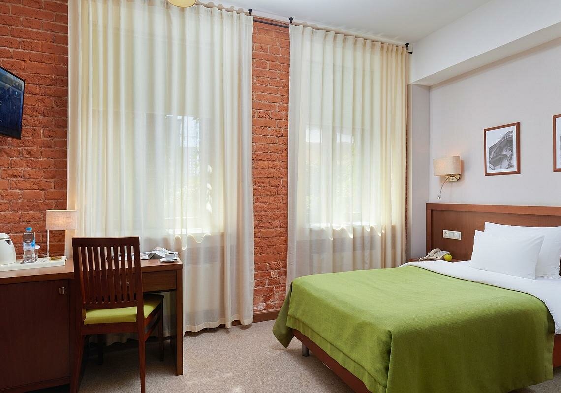 Однокомнатные номера, площадью от 16 м2 с двумя односпальными кроватями или одной двуспальной.Номера сочетают в себе оригинальность интерьера, максимальный комфорт и имеют просторную рабочую зону.