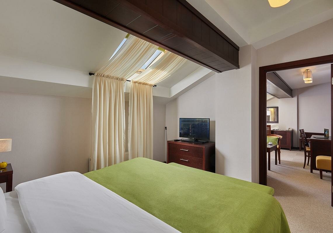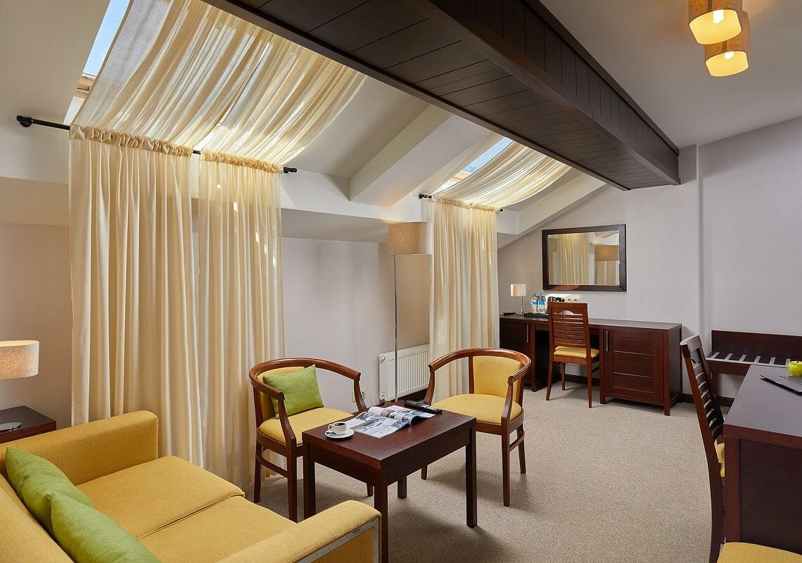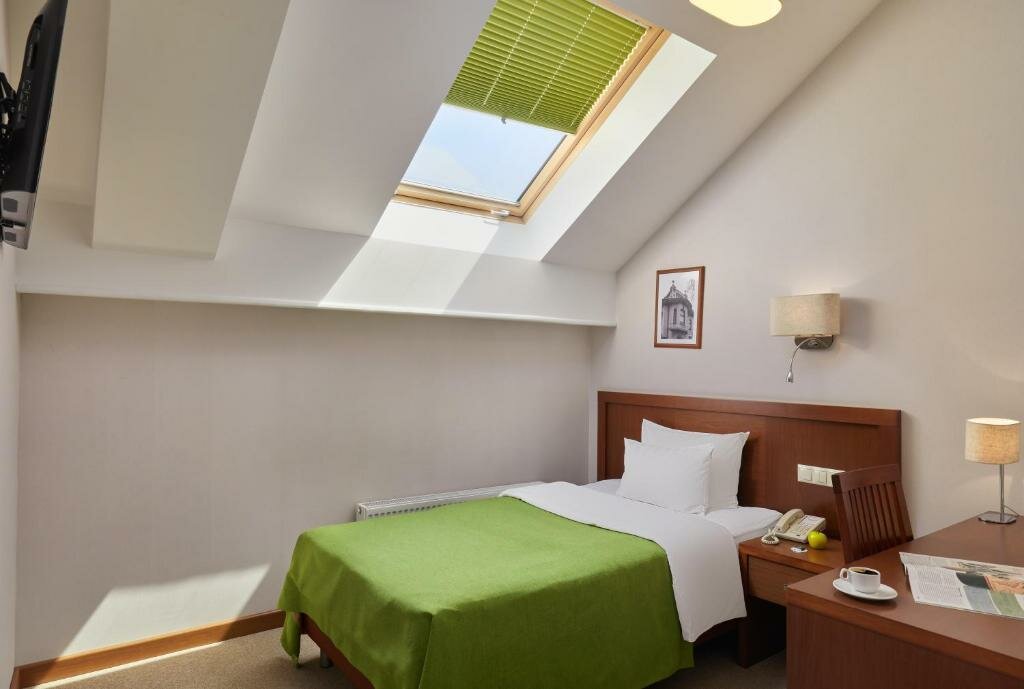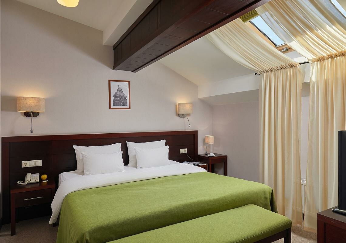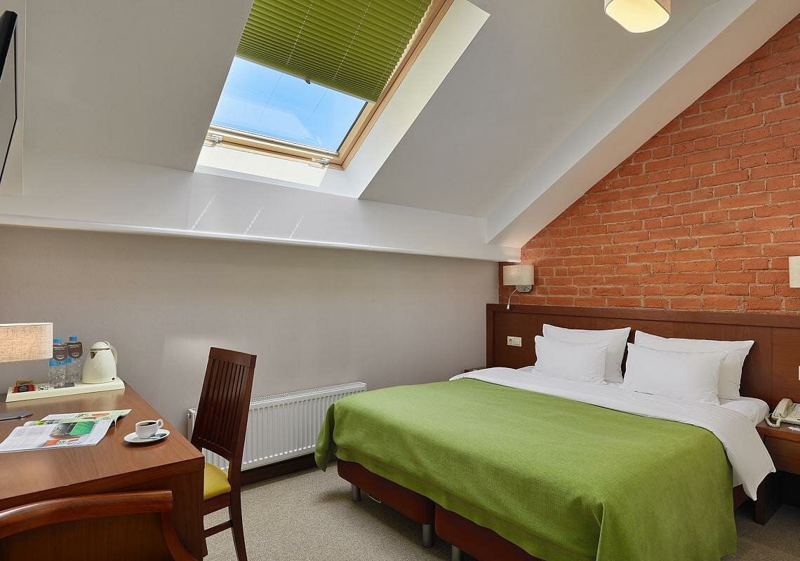 Люкс — современный двухкомнатный номер, площадью 47 кв. м., который состоит из уютной спальни и просторной гостиной. А оригинальные окна «мансардного» типа придают номеру дополнительную легкость и простор.