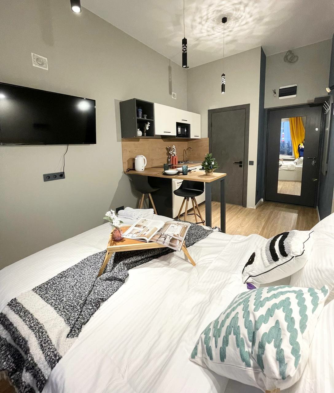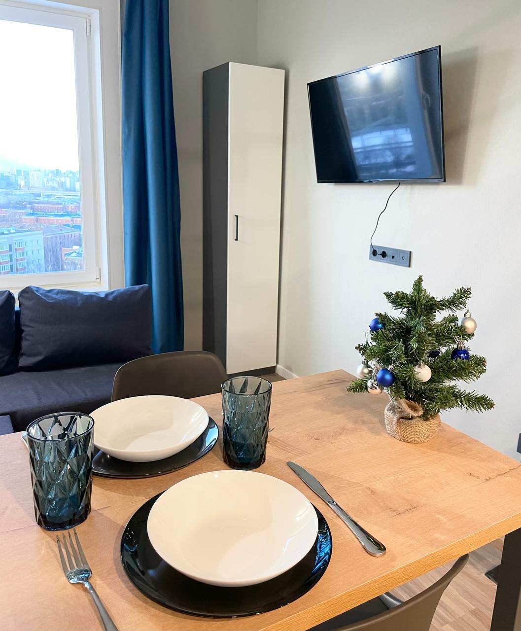Хороший и уютный номер. Чистый, все работает, ничего не ушатано. Удобное бронирование и вход. Не надо оформлять документы личным посещением, все делается удаленно, после оформления отправляют код для входа в дом и отдельный код для входа в номер. В номере был даже чайный набор, если с дороги забыли или не успели, без чая не останетесь, что очень порадовало. На верхних этажах красивый вид из окна на город, особенно в темное время суток.