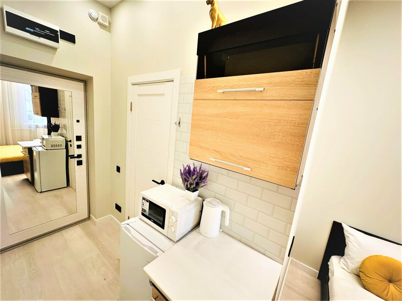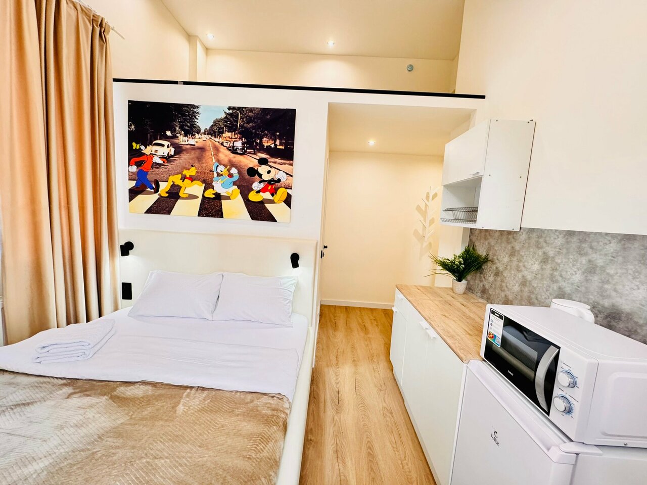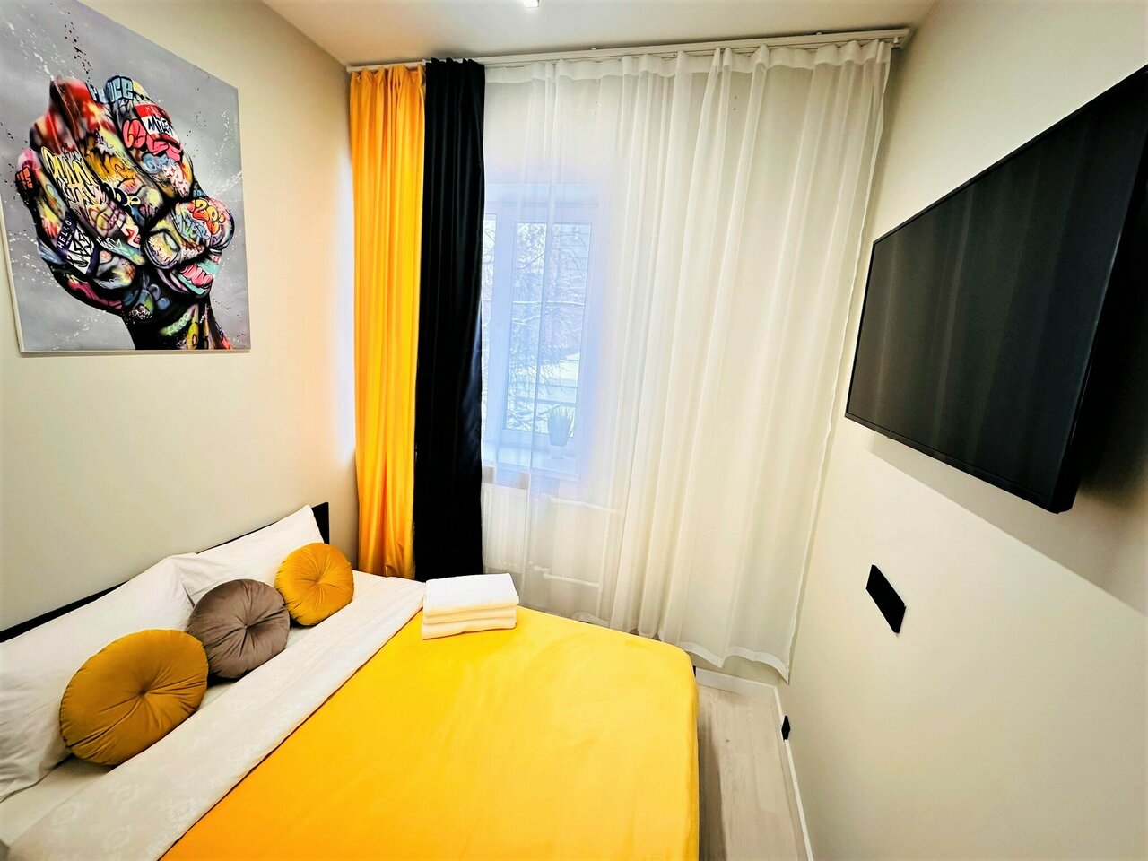 Уютная студия и недалеко от центра. В целом, неплохо. Однако стоит добавить одноразовые предметы в ванную комнату (шампунь, гель для душа, зубная щетка) Нет места для размещения вещей, стоит сделать крючки в ванной. Вай фай не позволял пользоваться телевизором. Были небольшие пятна на простынях.