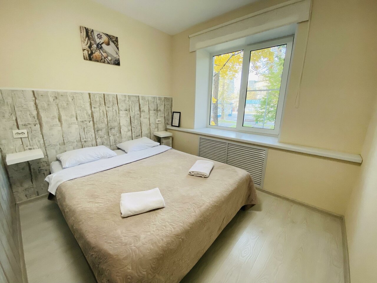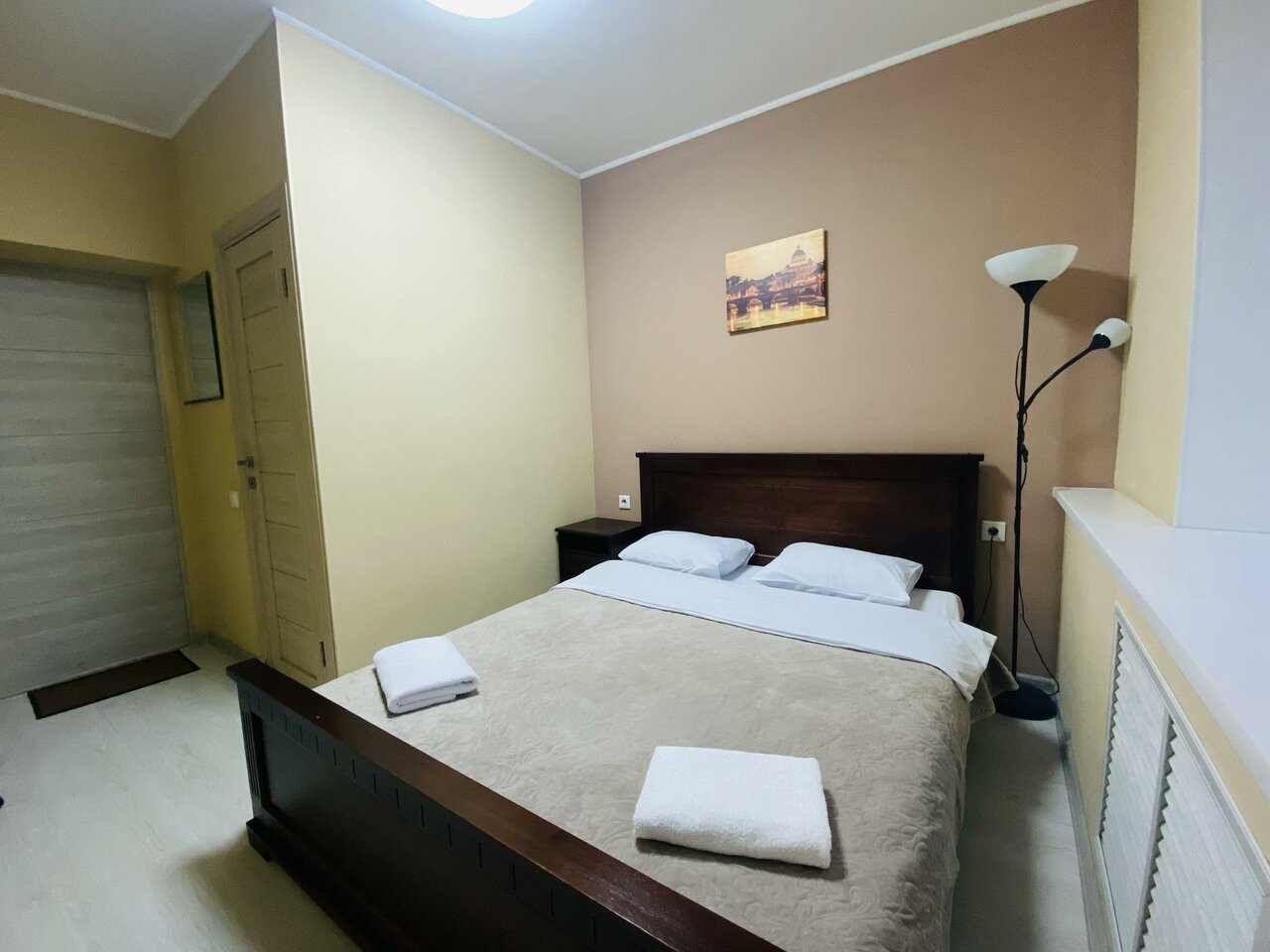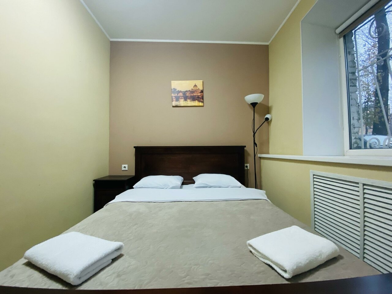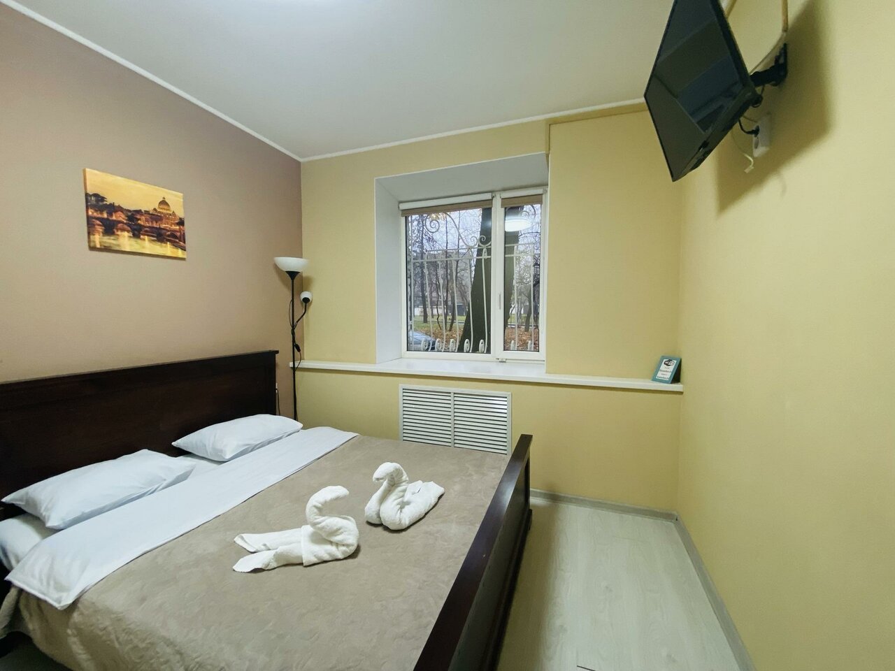 Один плюс-тихо и не так далеко от метро. Администратора увидели один раз, а может это просто уборщица. Опоздала на 1 час, быстро убрала номер, залив его чистой хлоркой. Отдала ключи, проверила перевод денег и исчезла. Больше её мы не видели. В ванной ни единого крючка, где можно повесить полотенце. Туалетную бумагулось искать в комнате персонала. Кроват жёсткая и жутко скрипит.