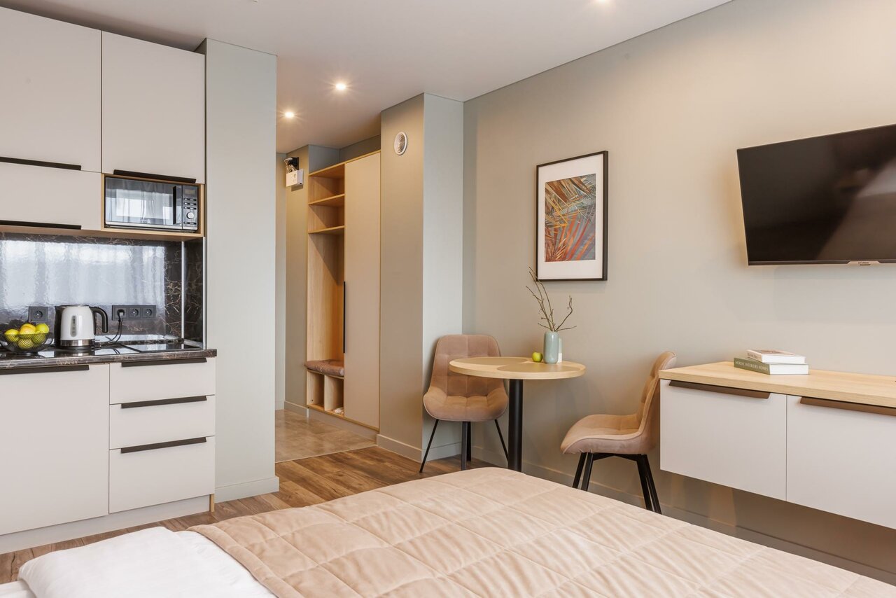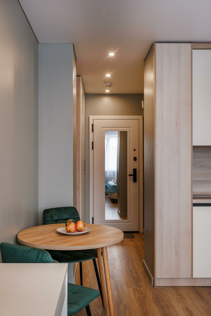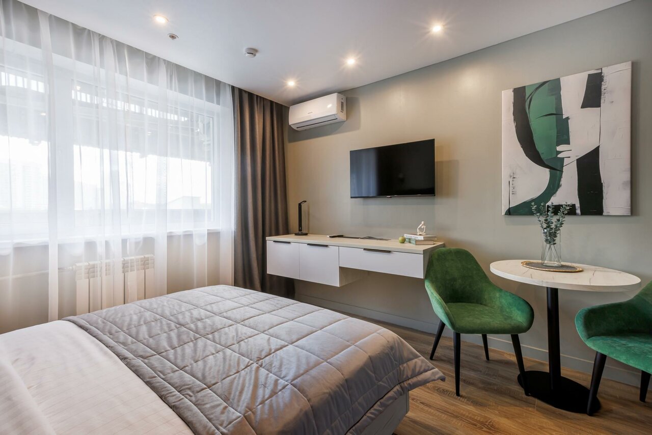 Отличный, уютный номер со своей кухней. За несколько часов до въезда выдали код для входа. Обслуживание отличное. В жару спасал кондиционер. С комфортом провели рабочую поездку. Спасибо!