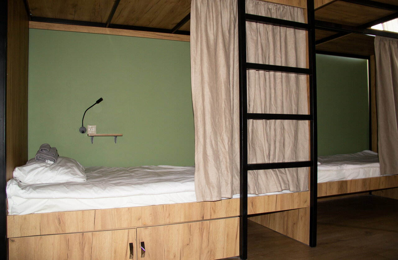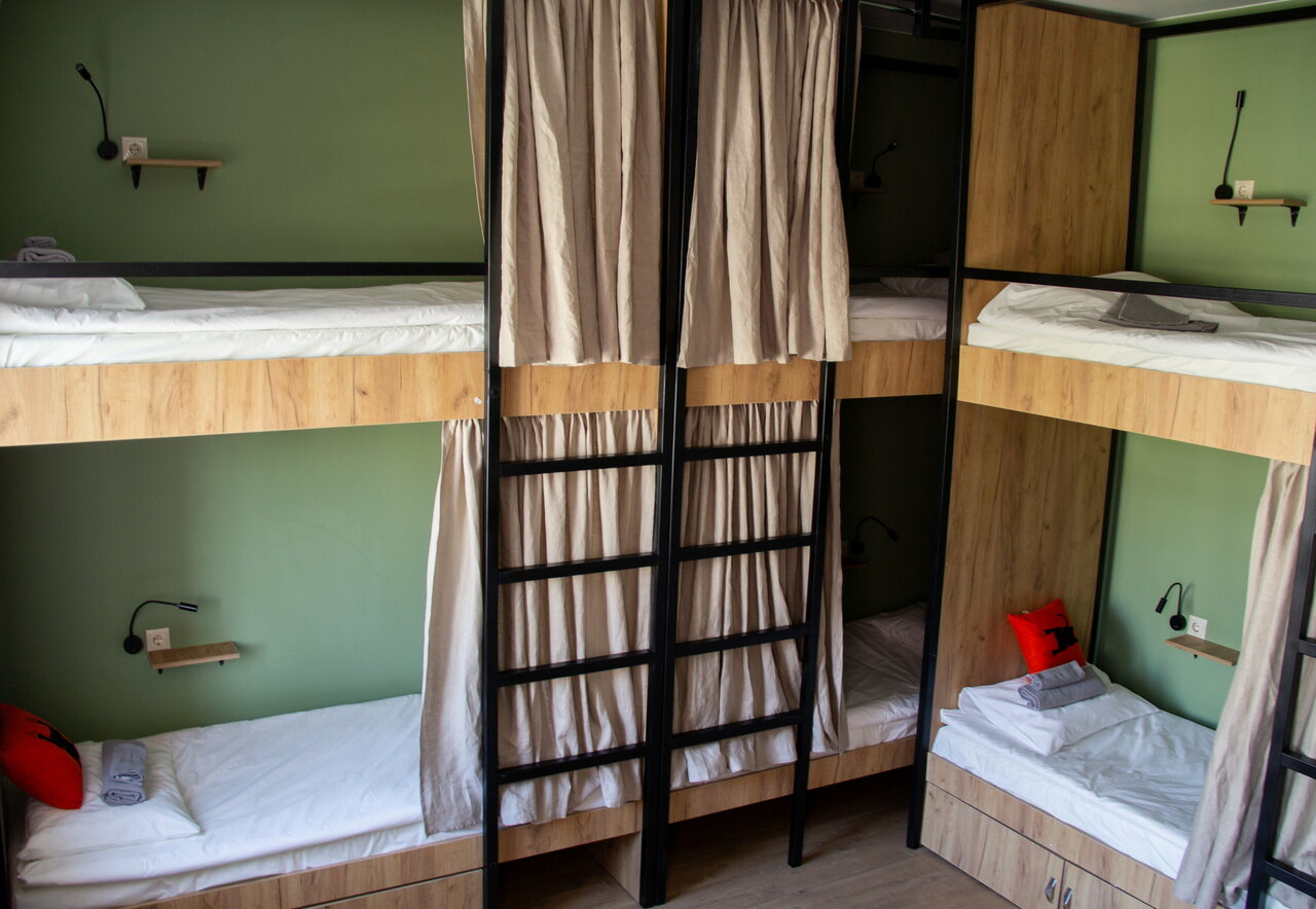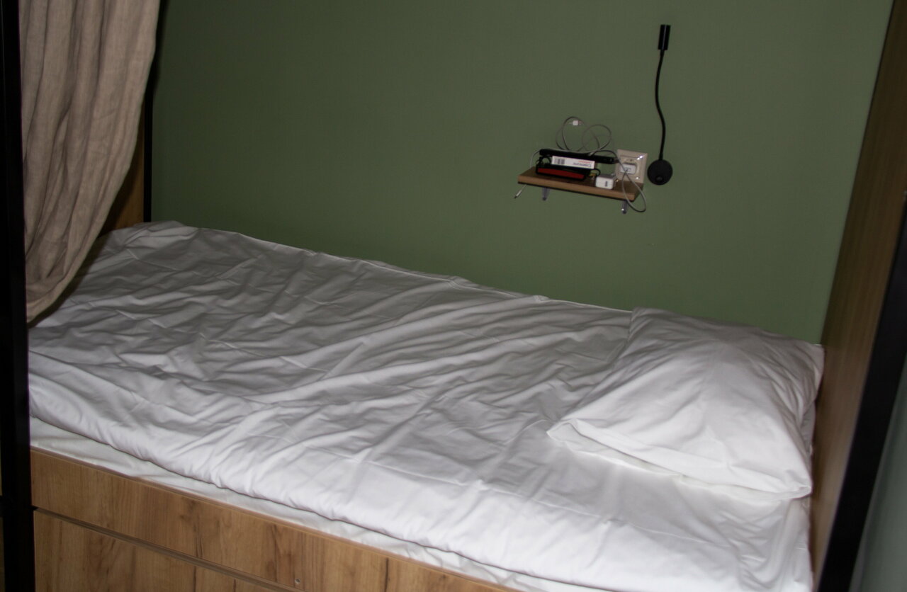 Чисто, уютно. Три санузла, душ. Шторки на кроватях, розетки и полочка. Шикарные матрасы. Большая кухня с ТВ, чайником, микроволновкой, холодильником. Чай и сахар бесплатны. Есть Wi-Fi. Персонал вежливый и приветливый. Стоимость 650р/сутки