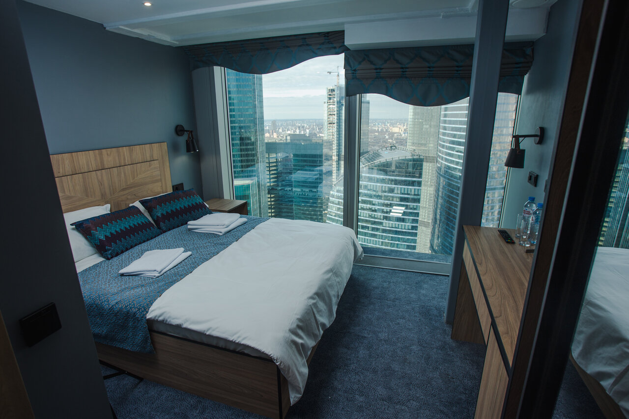 Очень красивый вид на город и на Сити, панорамные окна, классное расположение. Нет Wi-Fi, а мобильный интернет наверху ловит не очень шустро. Номера по размеру конура. Большую их часть занимает кровать. Это было в описании номеров, поэтому не удивились. Но есть особенности по персоналу…Мега-странный администратор с завышенной самооценкой, не соблюдающий субординацию, при встрече ‘в шутку’ назвавший нас гадинами, матерящийся и таскающийся за нами, пахнущий перегаром. Не знали порой, как от него избавиться). Но мы оптимисты, и восприняли это, как изюминку отеля, потому что такого оригинального персонала в сфере услуг мы ещё точно нигде не видели. В общем, как говорится, есть нюансы…