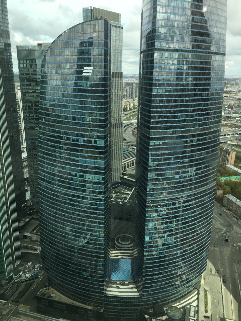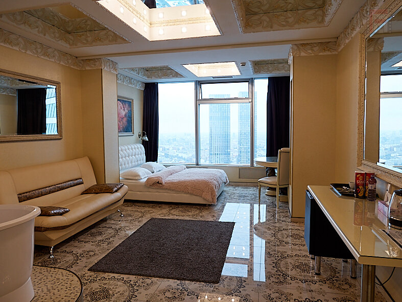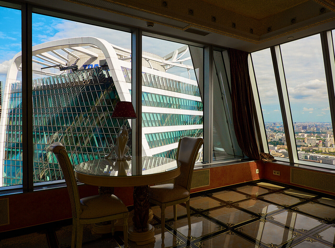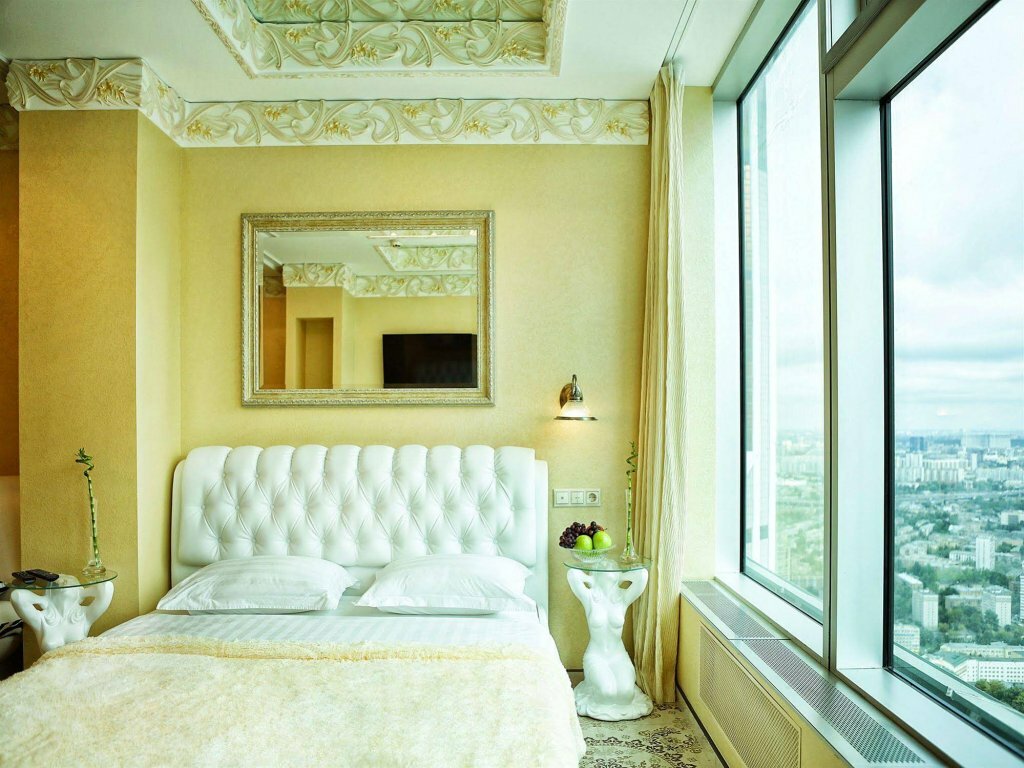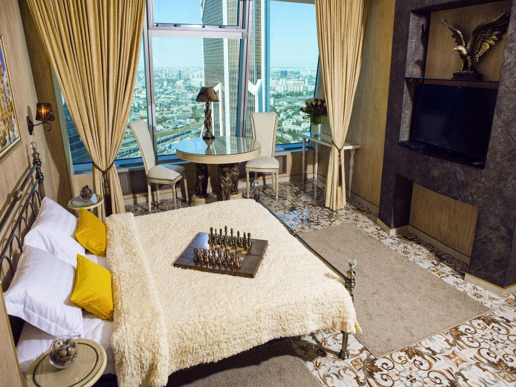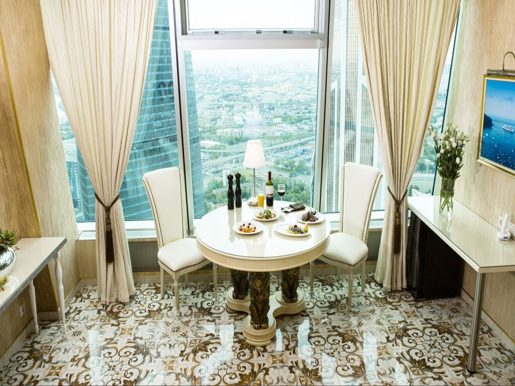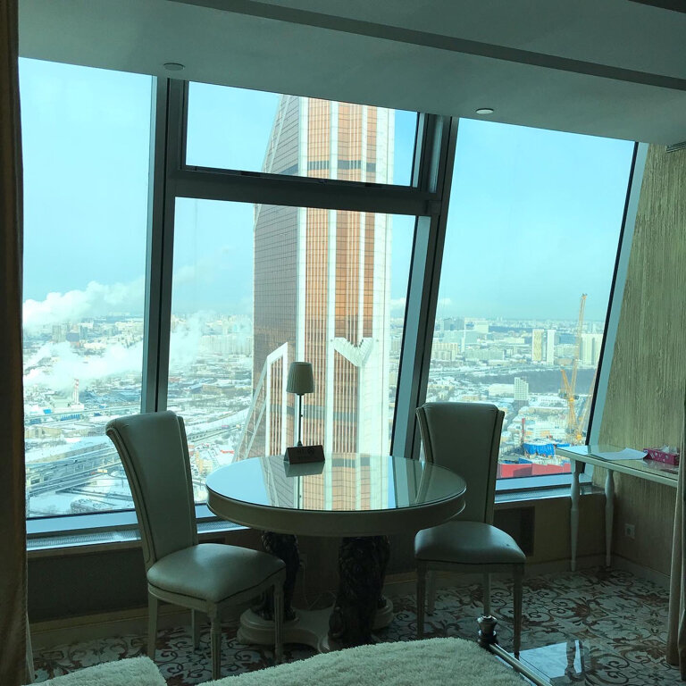 Шикарный вид из окна :) Хороший завтрак в номер. В номере обеденный и рабочий столы. Номер выглядит дорого-богато с налётом цыганского золота :) Сантехника и прочее в норме. Некоторые заморочки с регулировкой температуры, принудительная вентиляция шумновата. Пропускная система — взрыв мозга. Есть смысл выбирать именно эту гостиницу в двух случаях: 1. Хочется галочку ‘жил на 55 этаже Москва-сити’ 2. Деловое мероприятие в самом Москва-сити